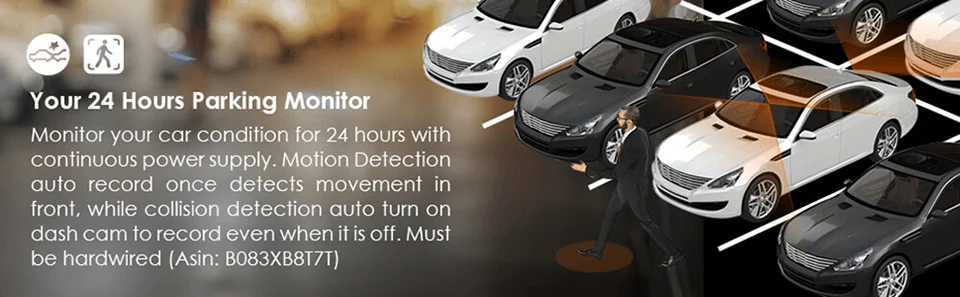 Monitor your car condition for 24 hours with continuous power supply.Motion Detection auto record once detects movement in front,while collision detection auto turn on dash cam to record even when it is off.Must be hardwired