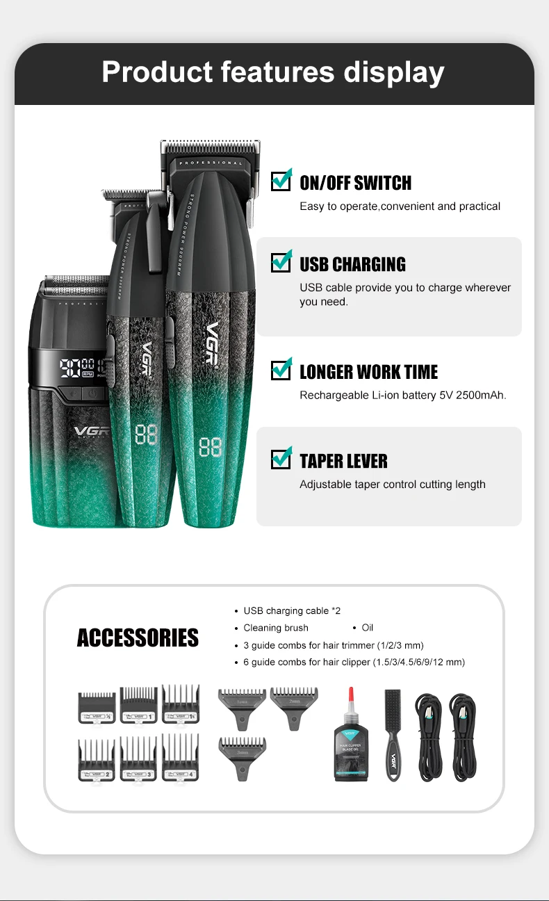 VGR Hair Trimmers Professional Hair Cut Machine Adjustable 9000 RPM LED Electric Clippers Metal Hair Trimmer for Men V-640 s3
