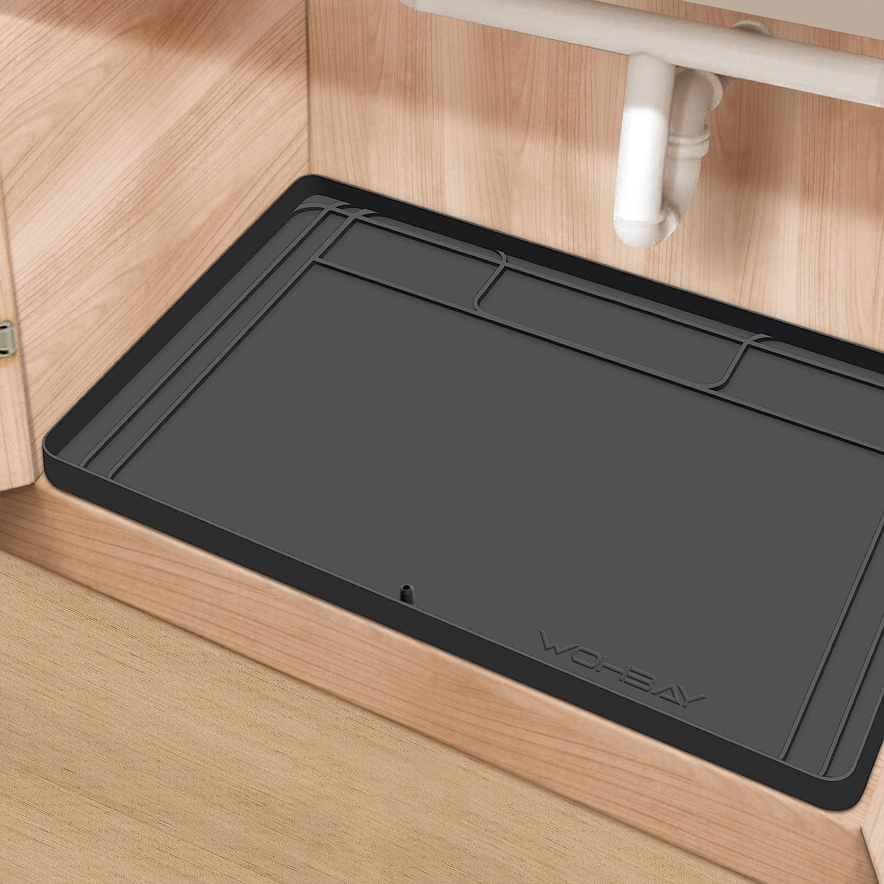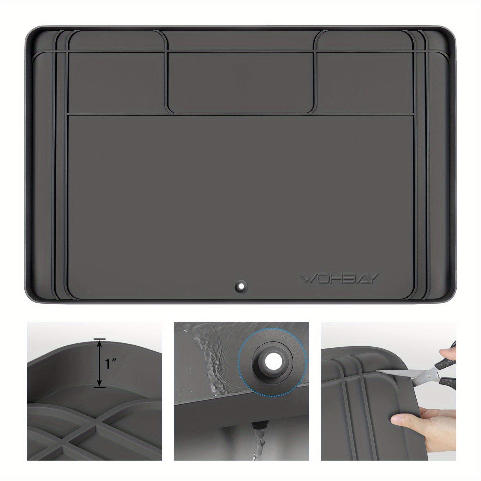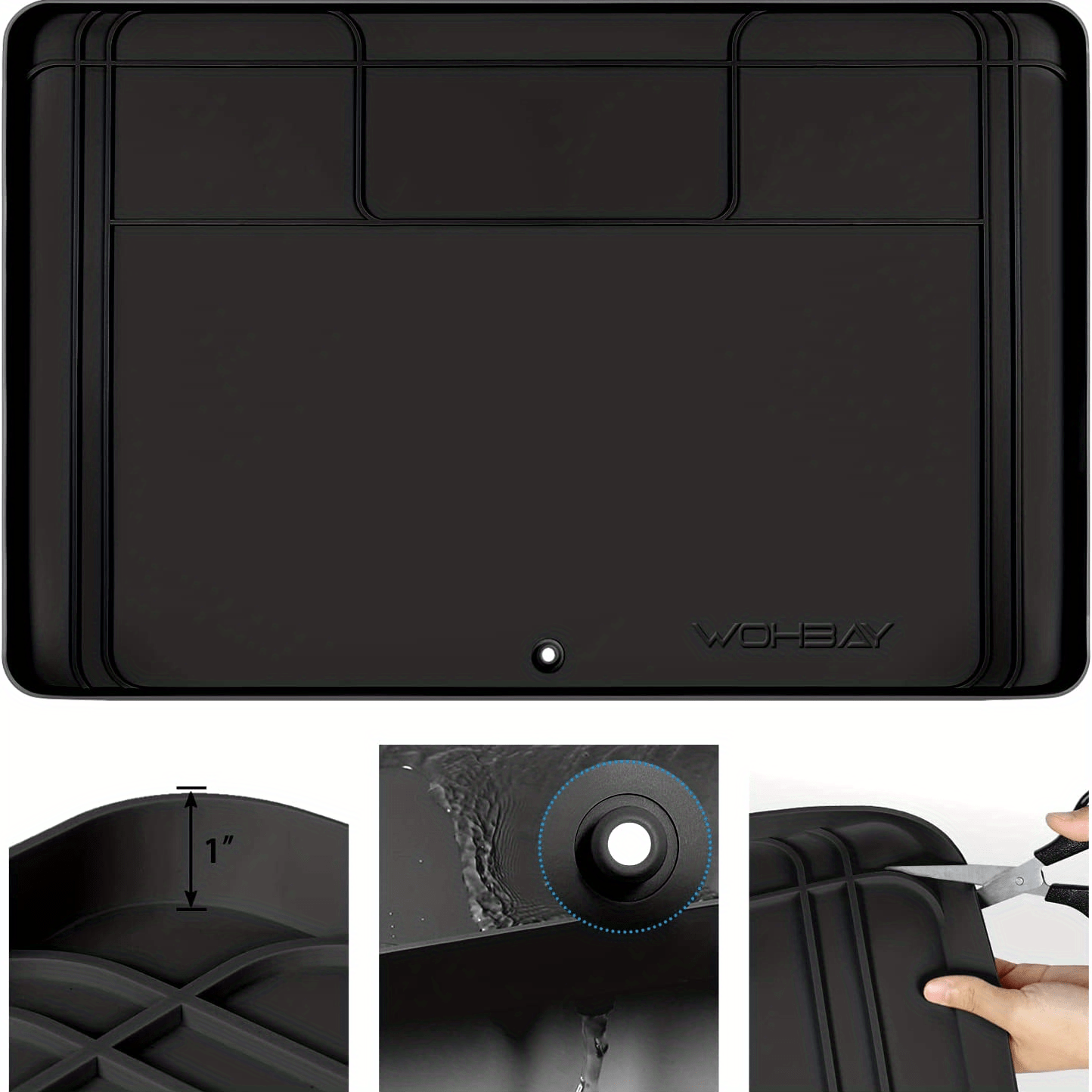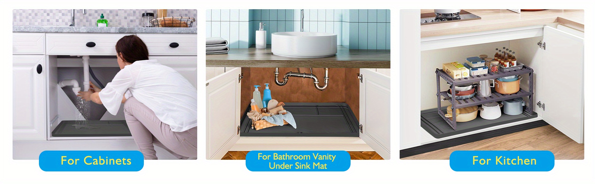 Under Sink Drip Tray: Designed with raised edges and waterproof silicone material to prevent dripping pipes from causing moisture problems, it can hold up to 3.3 gallons of liquid and keep cabinets dry and tidy.