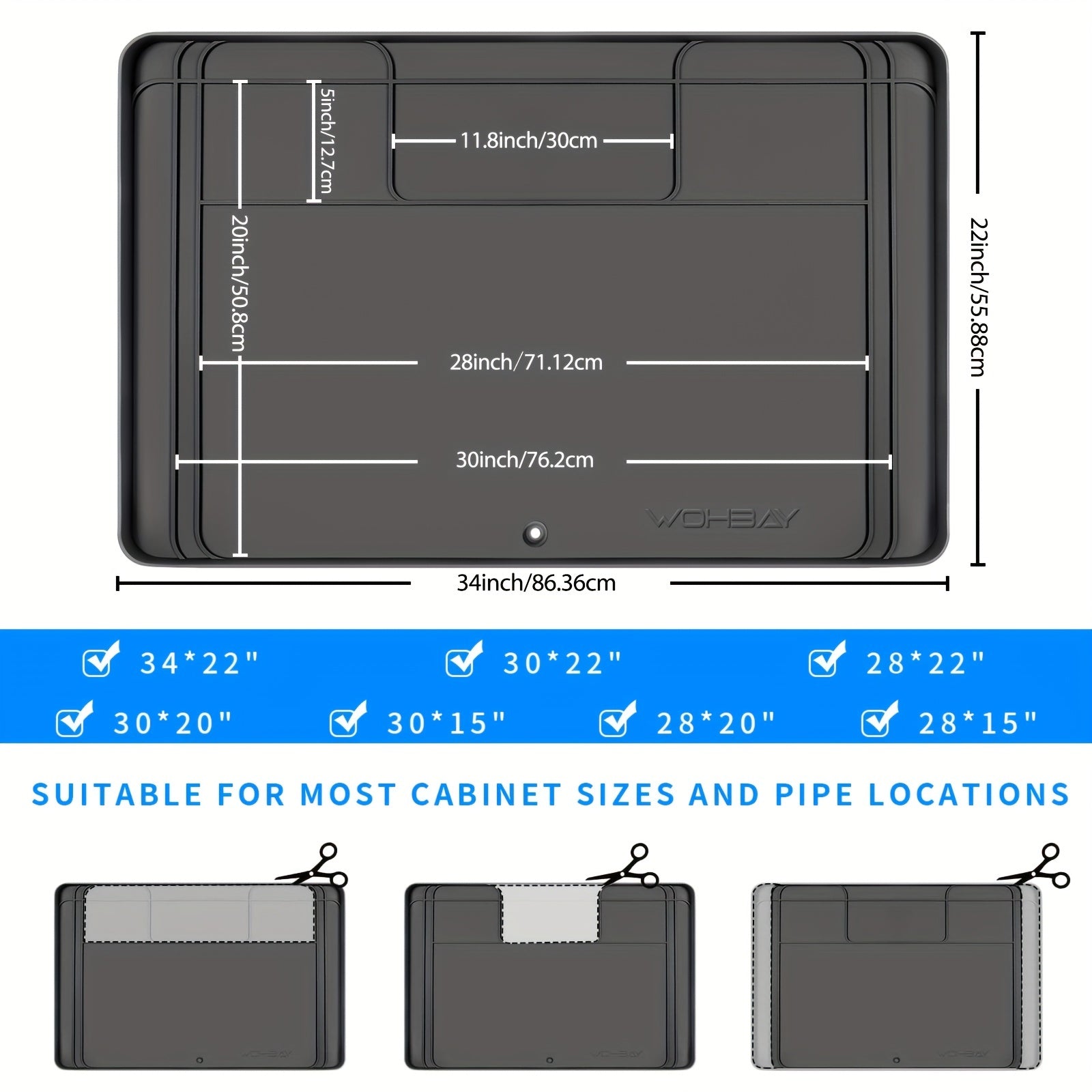 One fits more: Designed by Wohbay, the sink mat measures 34" * 22" and is compatible with standard 36" wide sinks, and can be cut along the height increase line to 34*22" 30*22" 28*22"30*20" 30*15" 28*20" 28*15"It can also be cut according to the position of the pipeline of the cabinet, which is basically perfect for various cabinets