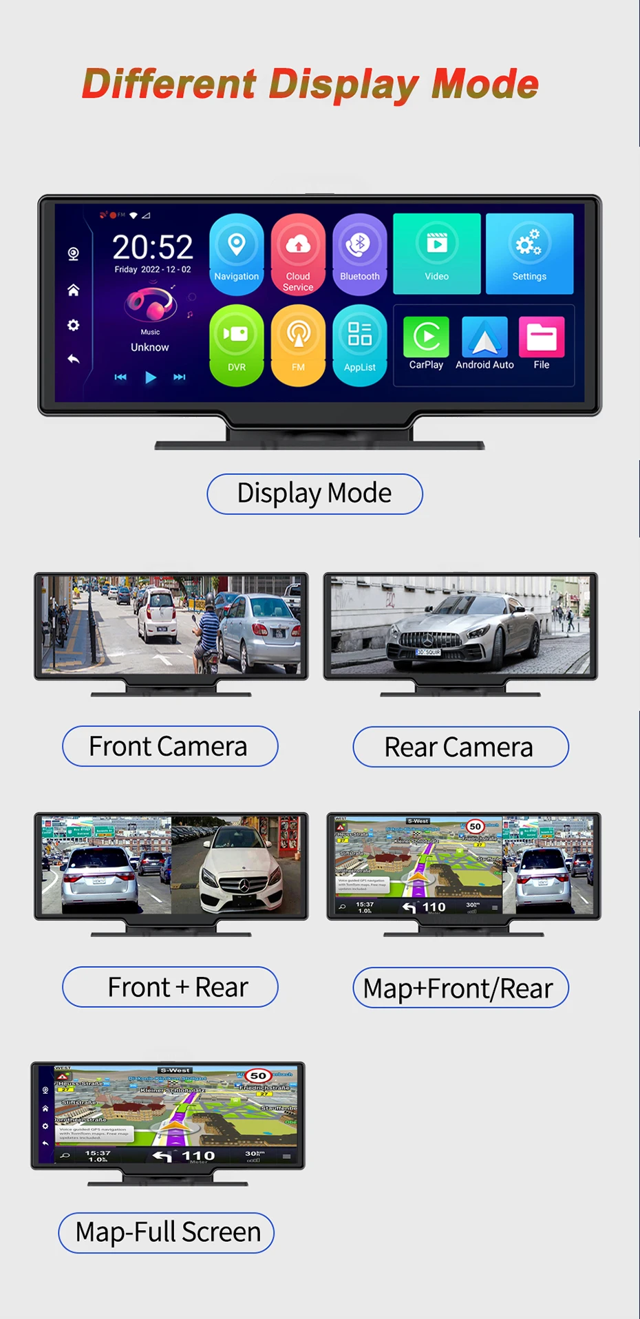 The DVR has 5 kinds of Operation Mode:1.Full screen front camera display ;2.Full screen rearview camera display 3.Front camera + Rearview camera showed at the same time 4.Map + Front camera/ Rearview camera showed at the same time;5.Full Screen Map.You can choose your the display mode according to your driving habit.