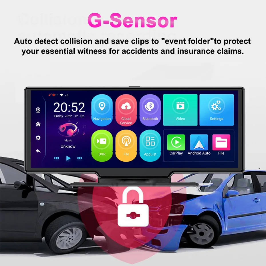 3-axis G-Sensor senses sudden acceleration, braking and collisions in order to automatically capture and protect critical footage surrounding an accident.