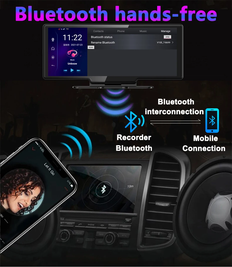 It built in bluetooth module, after bluetooth pairing with mobile phone, it could support the phone call on the car mirror dvr , or transfer the music songs to the car dvr from mobile.