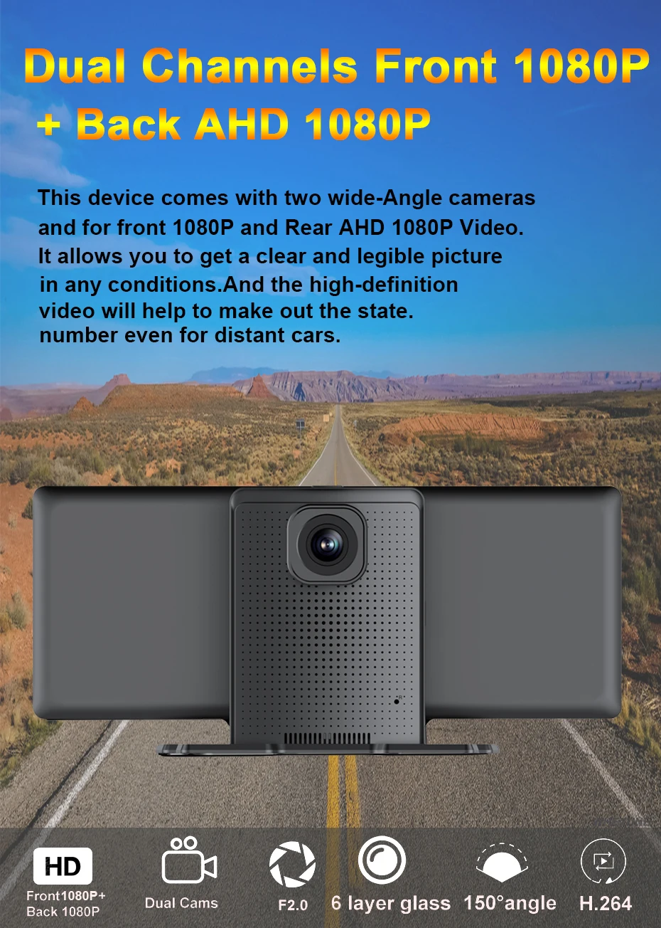This Device comes with two wide-Angle cameras and for front 1080P and Rear AHD 1080P Video.It allows you to get a clear and legible picture in any conditions.And the high-definition video will help to make out the state number even for distant cars.