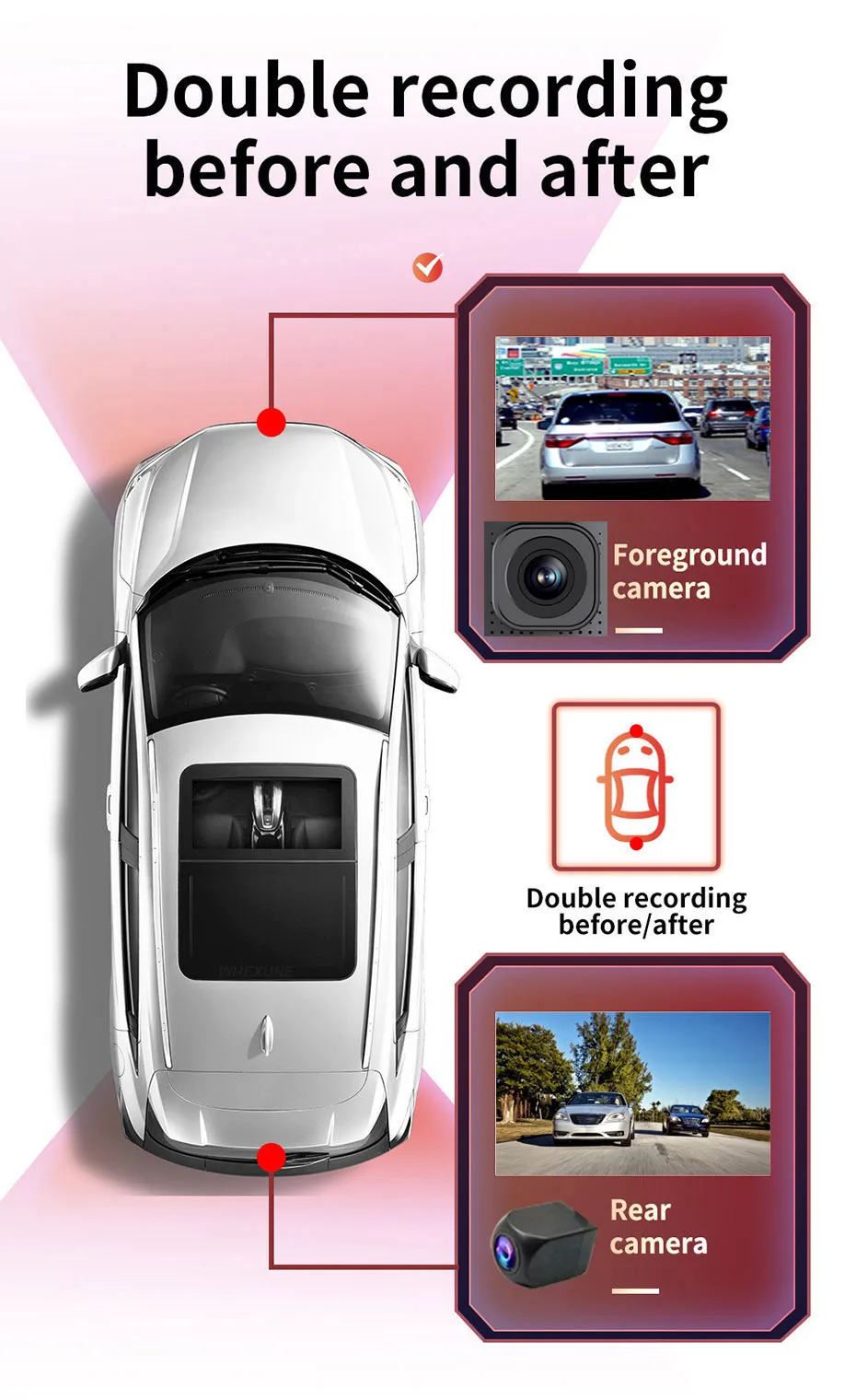 4. With Dual Recording: Front Camera 1080P + Rearview Camera 1080P.