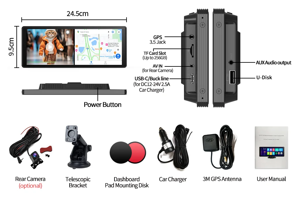 (3) AUX audio output: By using an AUX cable to connect with the vehicle's AUX interface, you can directly enjoy the original sound quality of the car. Low noise, high fidelity.