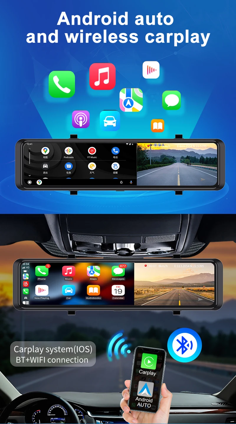 **Basic Features: Carplay & Android Auto, Dual Camera, G-Sensor, Cycle Recording, 24 Hours Parking Monitor, Time&Data Display, Wide Dynamic Range -
