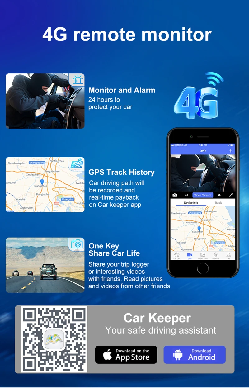 Track the location of your car, remotely capture what happen to your car from anywhere in the world. View images and watch video clips of your car with App on your smart phone once you are connected to the internet.