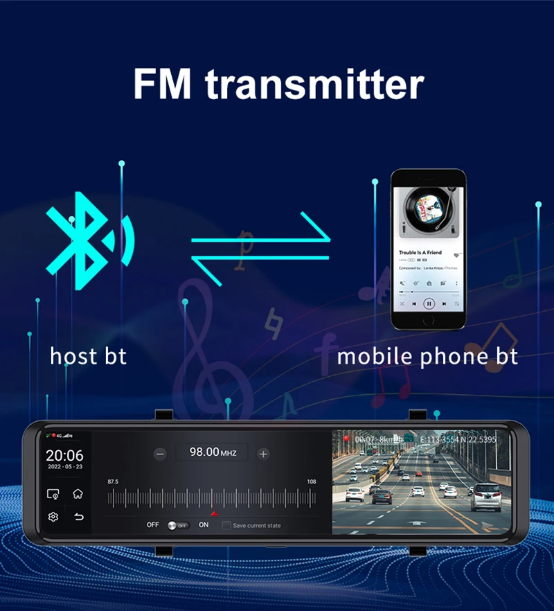 Supports bluetooth hands-free, after pairing the bluetooth between dvr and smartphone,you could make and receive calls directly from the mirror dvr itself with the built-in MIC and speaker.
