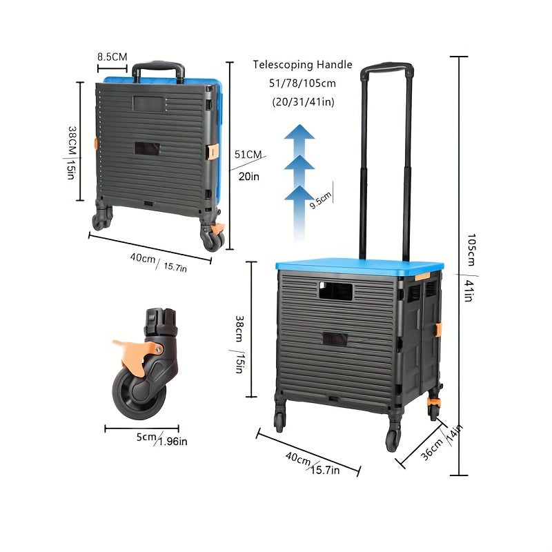 【Foldable Design, Easy to Store】This compact rolling crate can be folded easily with dimension 17.32×15.75×3.35 inch, save more space, and light weight(8.16 lbs), easy to carry in your backpack or by hand for actual needs, and unfold the trolley whenever use, more convenient.