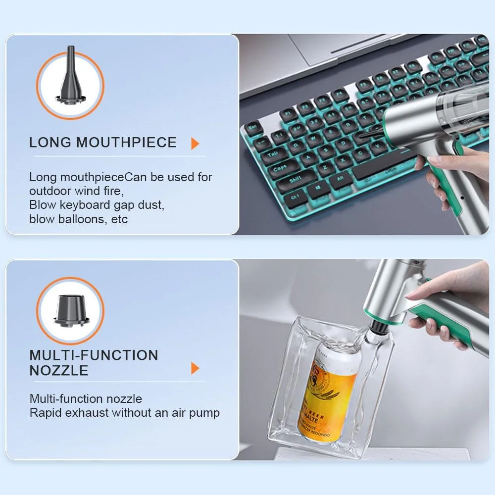 is the vacuuming effect, can as dust buster, and the other end is the blowing function, can as Air Dust Blower. The handheld
