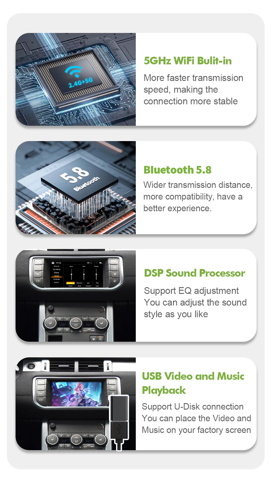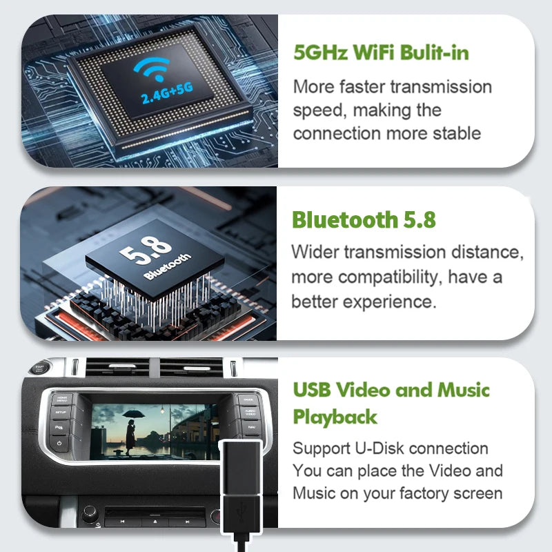 1. Built-in 5GHz WiFi: Compared with 2.4G WiFi, it has more than three times the transmission speed, making the carplay connection more stable;