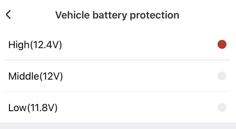 optional high(12.4V) / medium(12V) / low(11.8V), when the car battery is lower than the selected voltage, the recorder will automatically shut down to prevent the battery from losing power.