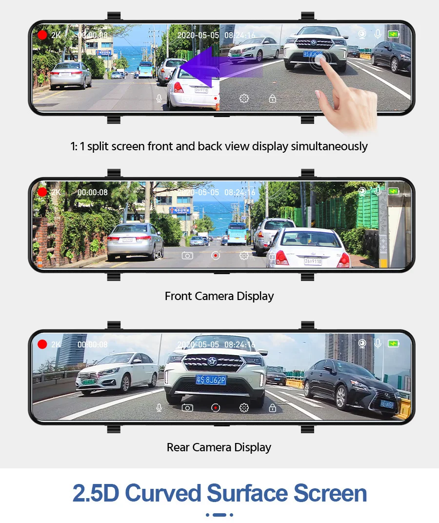 1:1 split screen design to switch front and rearview recording,big screen and clearly and ersily to check rear view.You can switch views by swiping your finger left or right.It contains 3 views:front view,rear view, front & rear view.