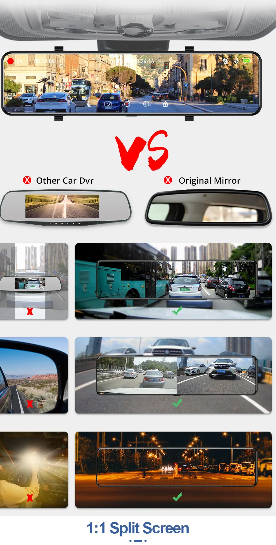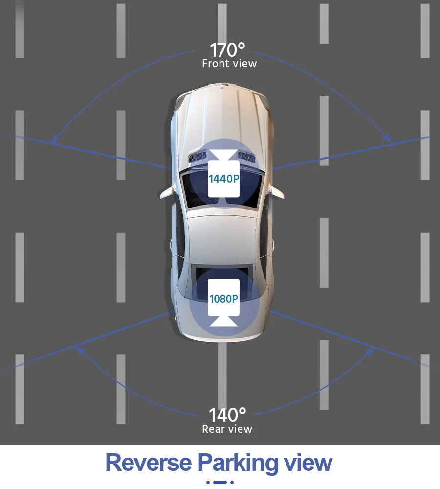 170 Degree Angle 1440P front camer with 140 Degree Angle 1080P Night vision Rear view Camera (Optional),allows for simultaneously recording videos from two different angles.Two split view make you have clear view from front and back-up camera.