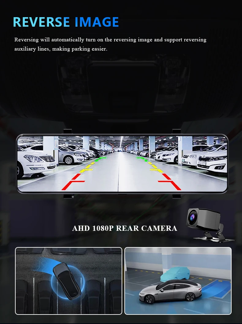 When the car is in reverse gear, the dashcam picture will automatically switch to the rear camera, and the reverse auxiliary cable will appear. Make reversing, warehousing and other behaviors safer; Note: This feature must connect the red wire of the rear camera to the positive pole of the reverse headlight.