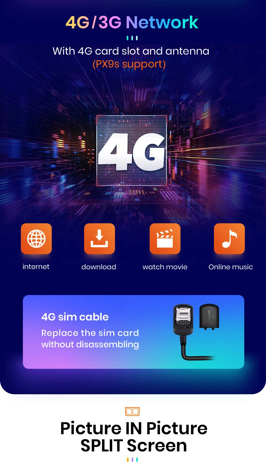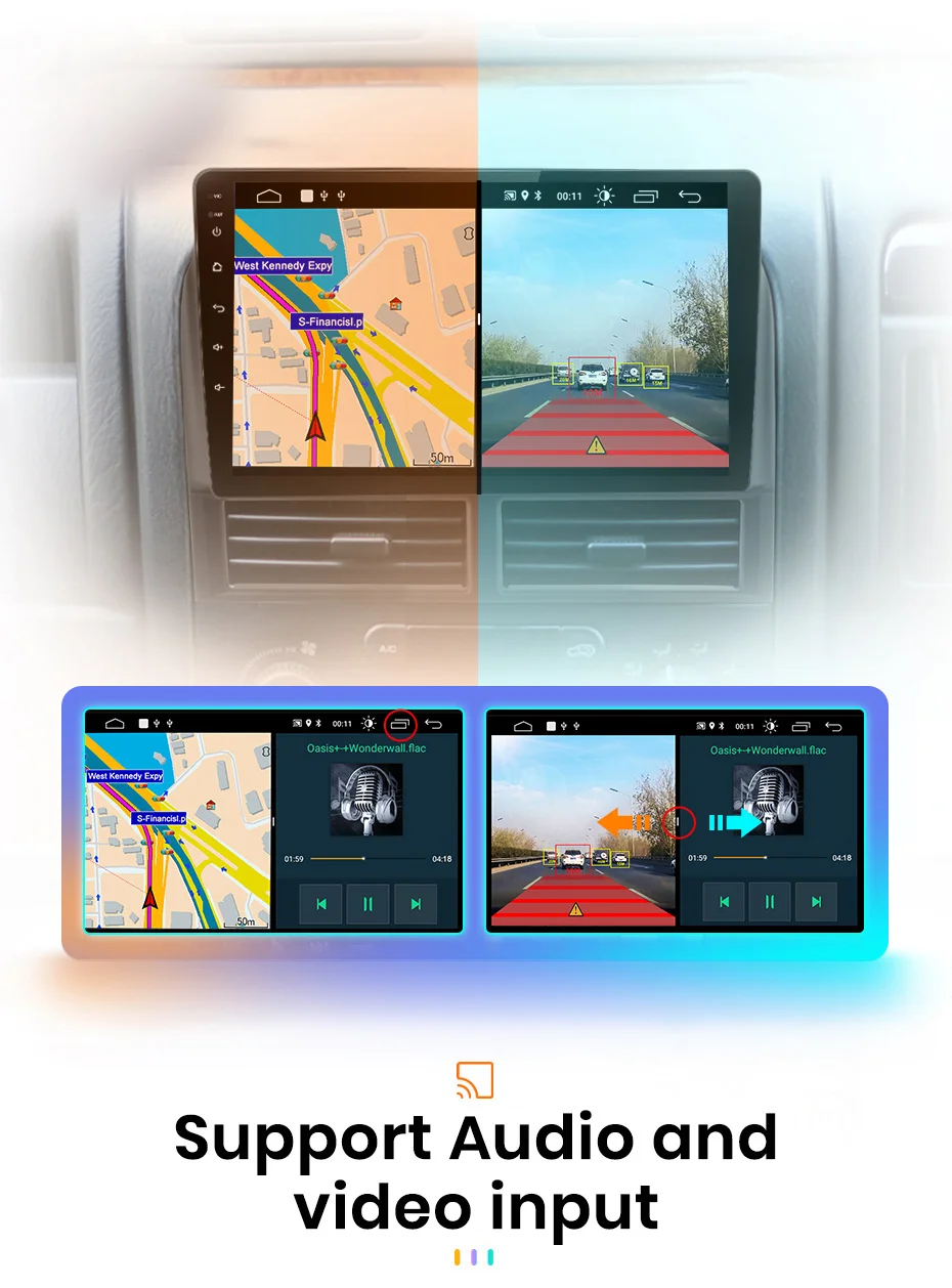 It can show 2 applications on screen at the same time, easier to operate the device. For example, the device can navigate and play music at the same time when splitting screen.