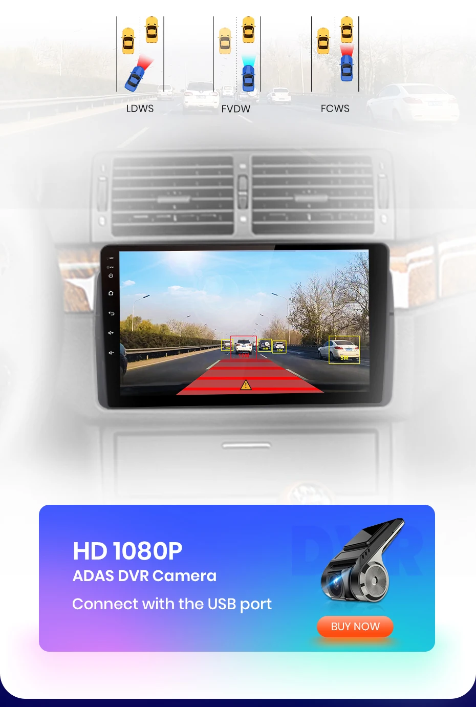 When the car radio is connected with ADAS video recorder, it will make Advanced Driving Assistance System work, and will warn you if your car is too close to front vehicle or if your car deviates from the lane, to help your driving safer and easier.