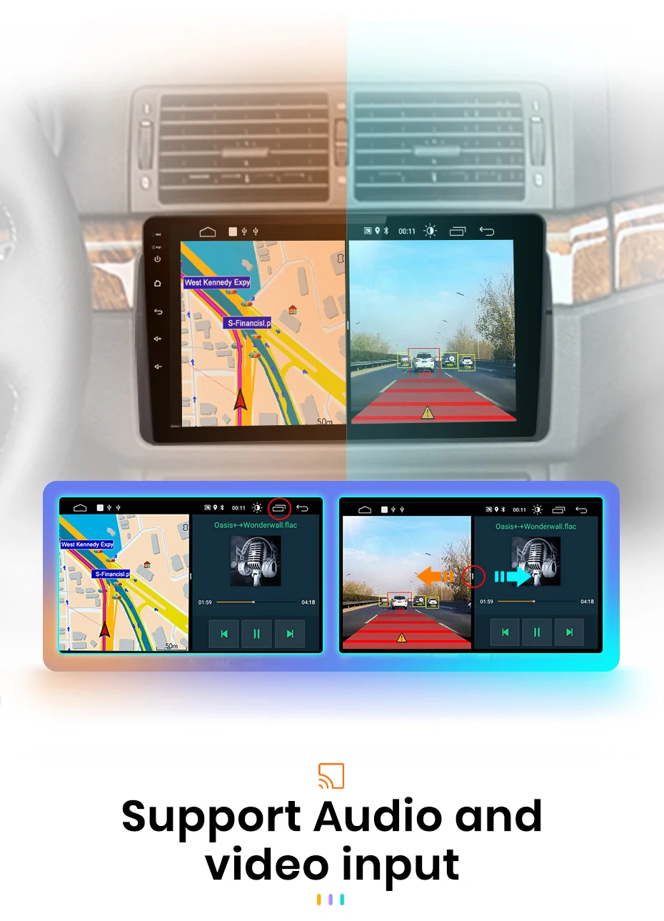 It can show 2 applications on screen at the same time, easier to operate the device. For example, the device can navigate and play music at the same time when splitting screen.