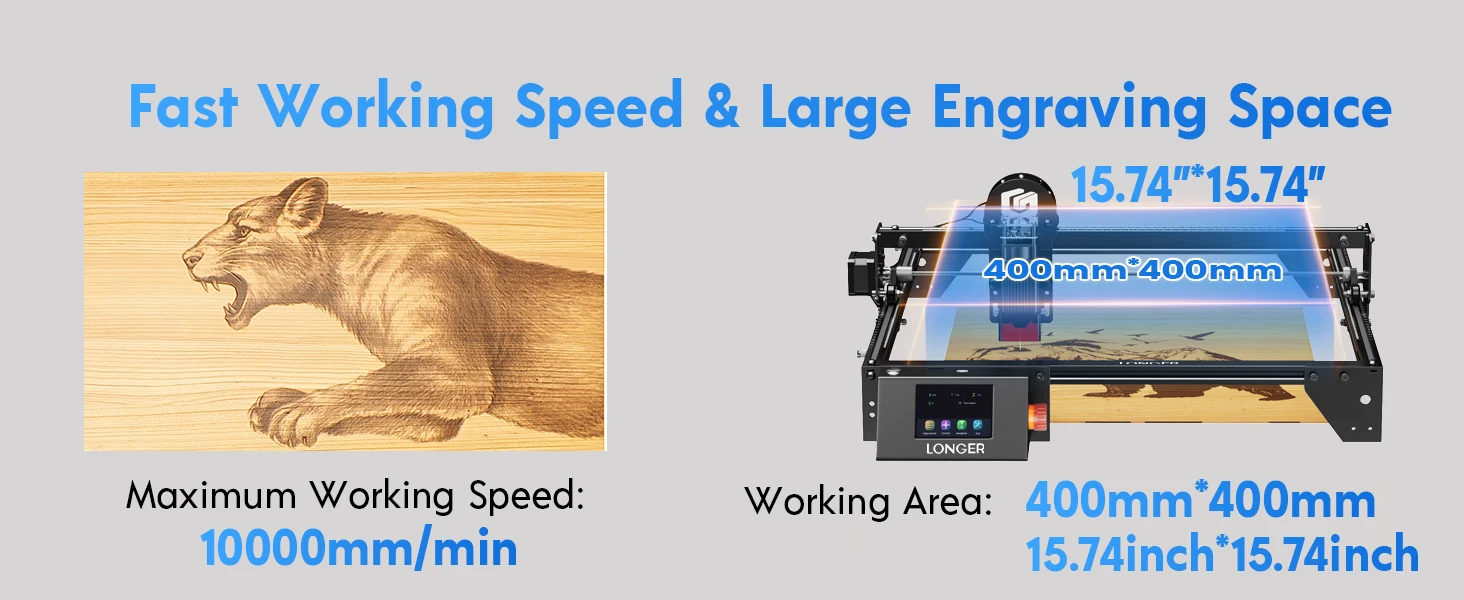 【Superior Cutting】: Longer RAY5 5W laser engraving machine features exceptional cutting capabilities, effortlessly cutting through 0.8 inches/20mm thick wood boards and 1.2 inches/30mm thick acrylic. Its spacious 400*400mm working area allows for the efficient completion of various processing tasks.