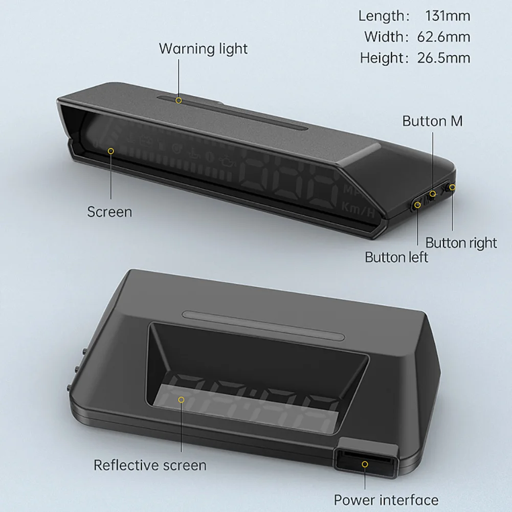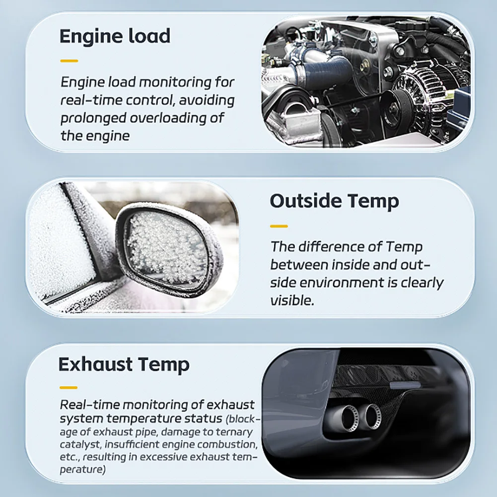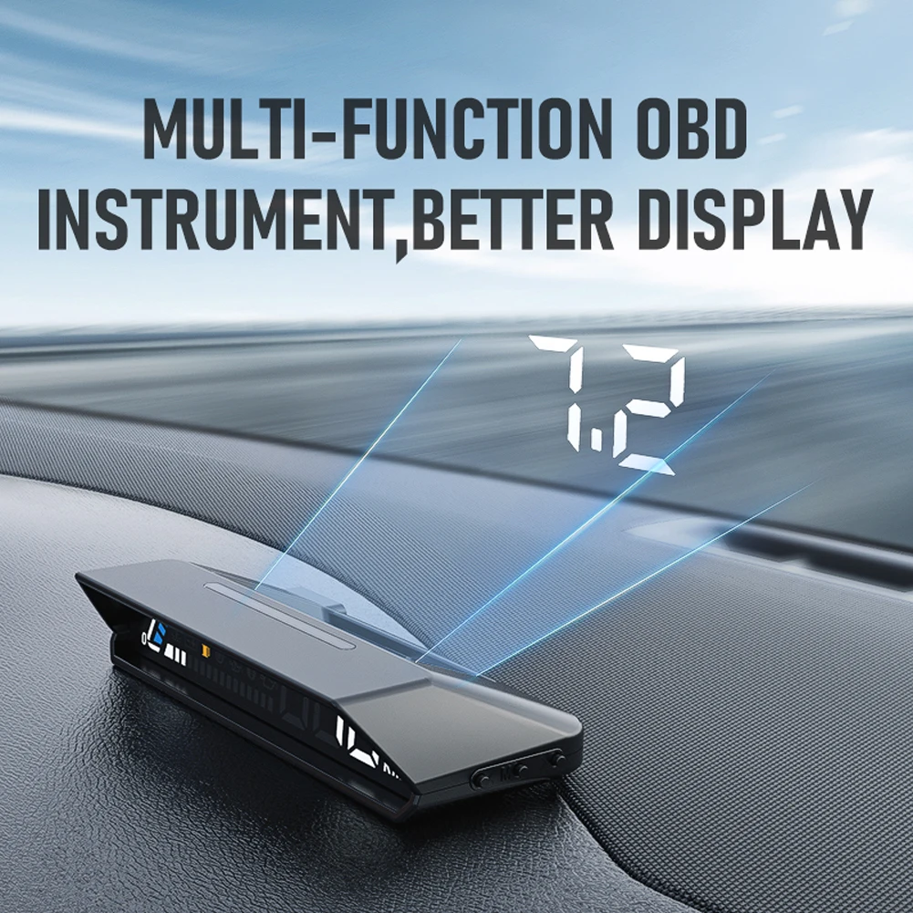 OBD2 mode: speed, RPM, water temperature, voltage, fuel consumption, clock, single driving distance, single driving time, oil temperature, turbo pressure, acceleration test, speeding alarm, engine failure alarm, eliminating fault codes, water temperature alarm, RPM alarm, voltage alarm, public mileage switching, fatigue driving reminder, automatic and manual brightness adjustment and so on.