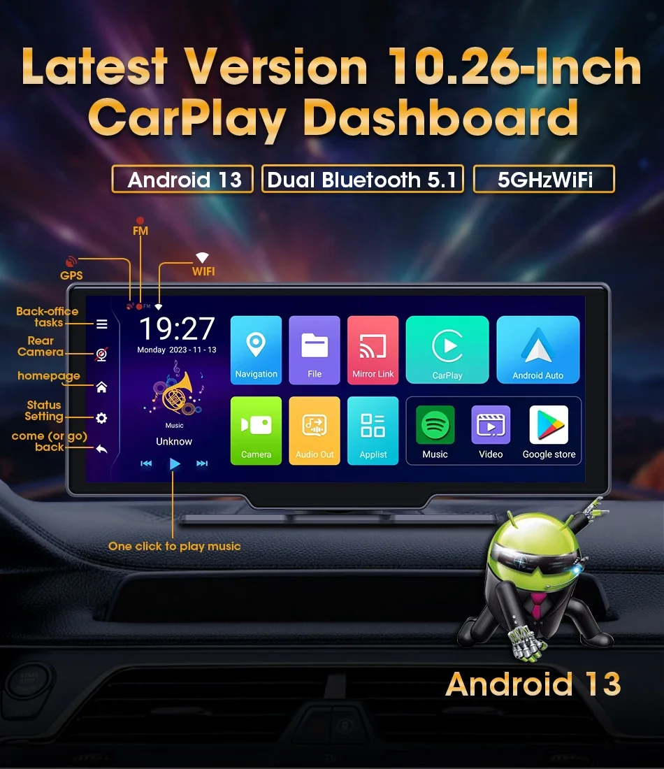 Srnubi 8 Core 10.26'' Car DVR Android 13 CarPlay&Android Auto Dashcam Smart Screen Rear Camera 5G WiFi GPS 5.1 Bluetooth AUX FM