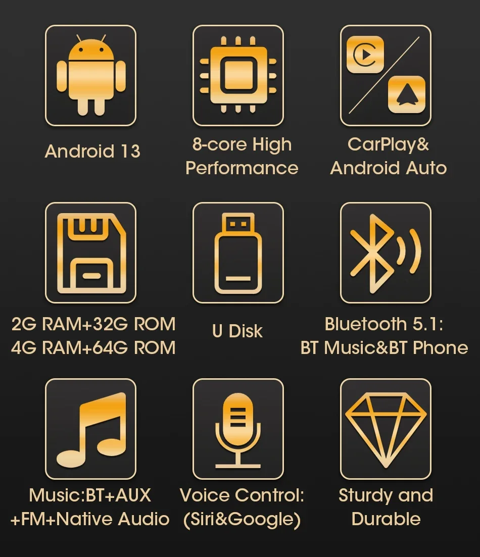 (3) AUX audio output: By using an AUX cable to connect with the vehicle's AUX interface, you can directly enjoy the original sound quality of the car. Low noise, high fidelity.