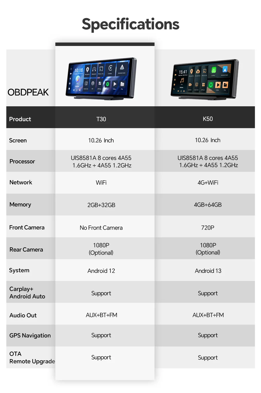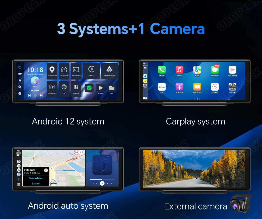 The OBDPEAK T30 has a crazy built-in 3 system, Android 12 system/Carplay system/Android Auto system, and has added an external camera to meet all your car driving needs!