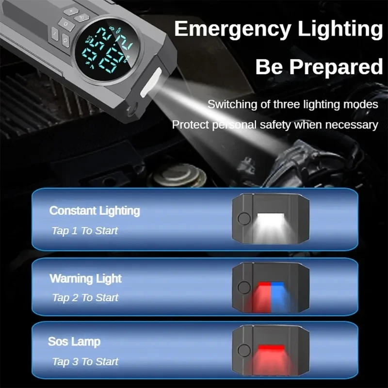 Experience the convenience of our Car This powerful device combines a jump starter, tire inflator, and USB charging capabilities, making it a must have for every driver.