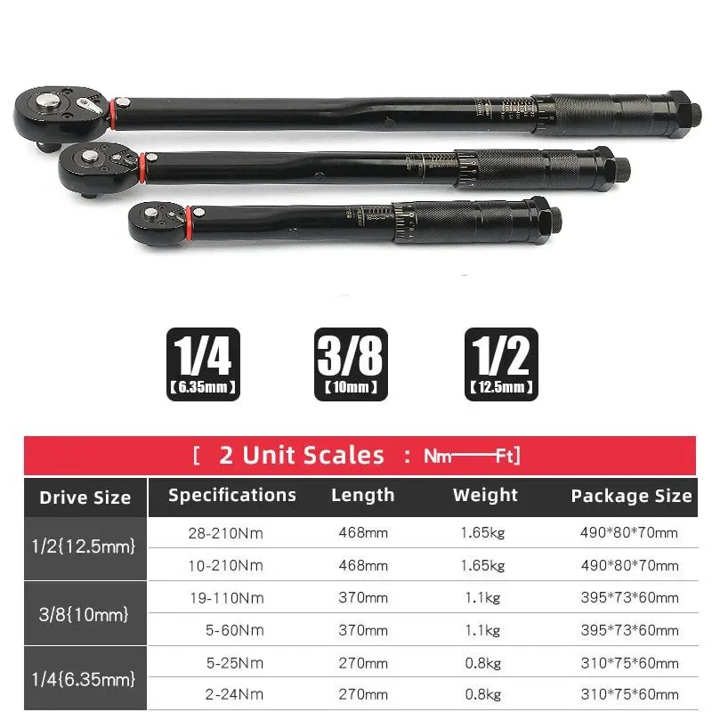 - 1/4",3/8" ,1/2" Square Drive 2-210N.m torque range (fully adjustable)