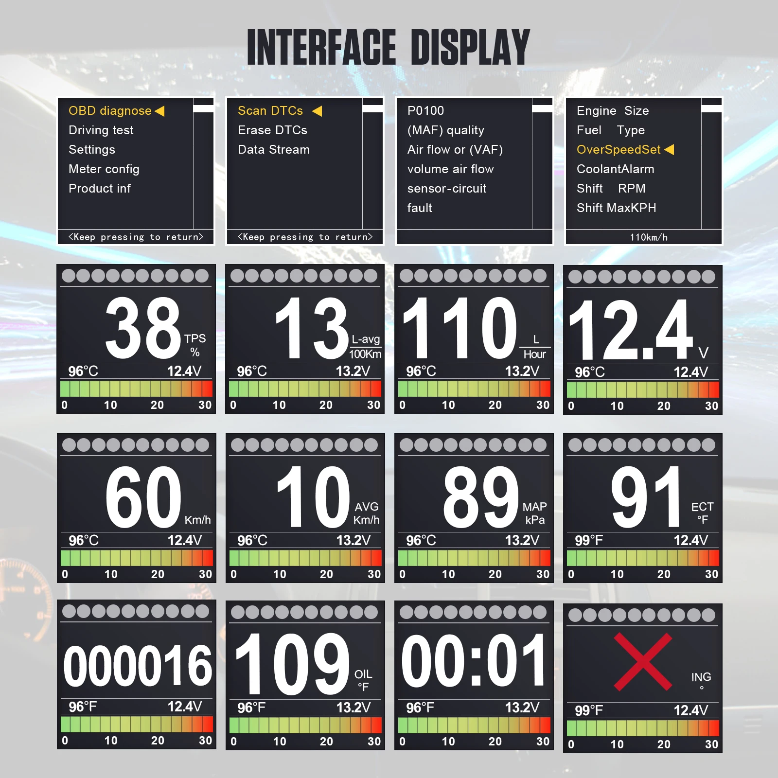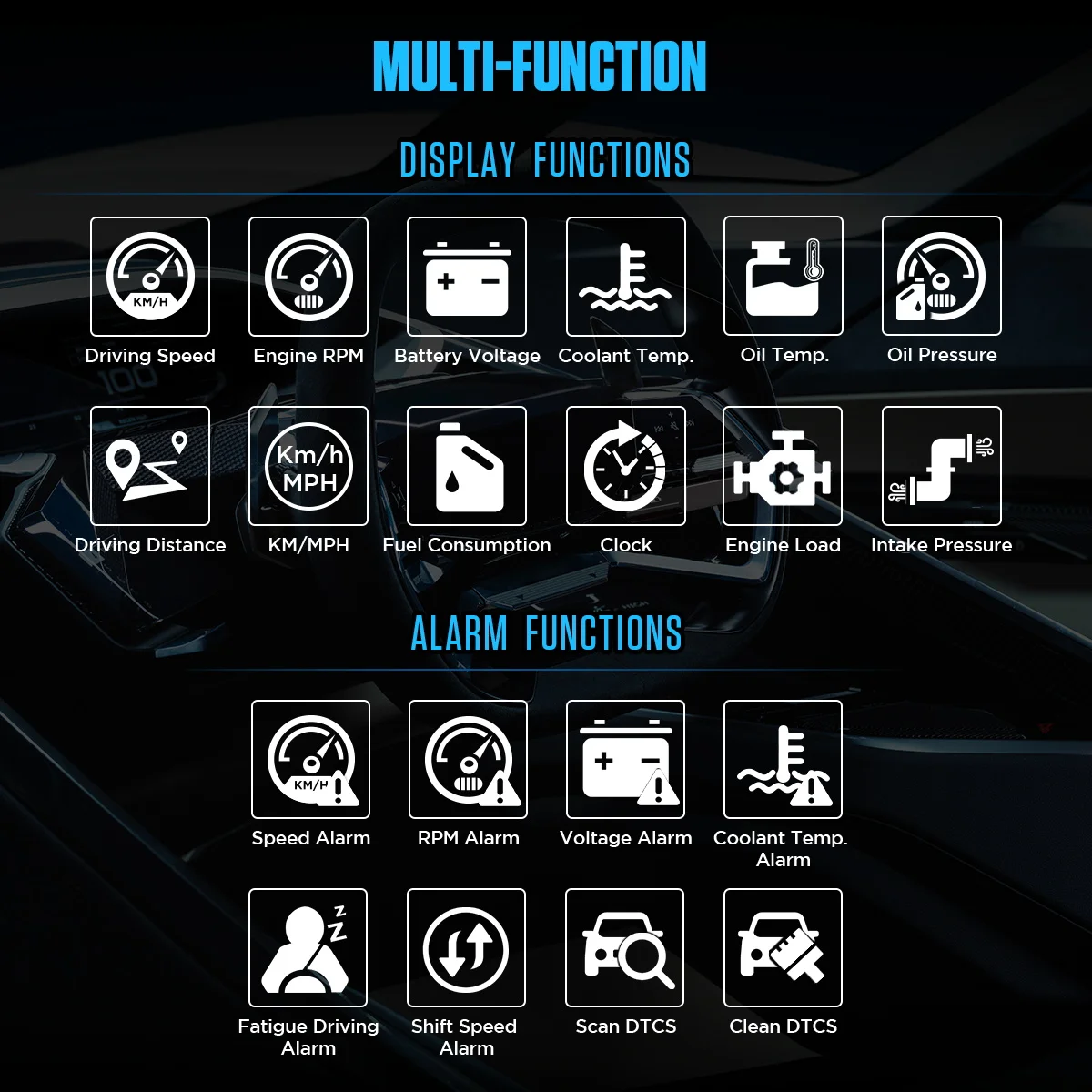 4.Display Data: speed,RPM,coolant,voltage temp,oil temp,oil pressure,driving distance,fuel consumption,clock,engine load,intake pressure