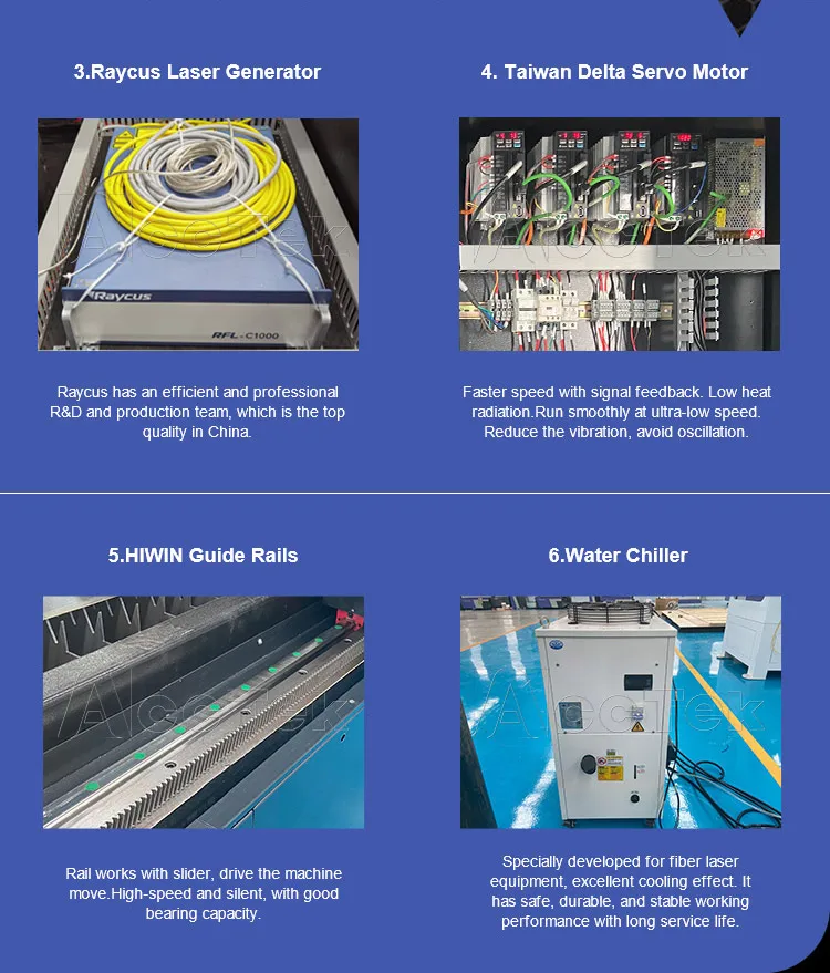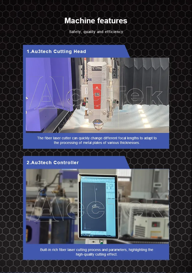 1) Au3tech laser cutting head It was designed for flat cutting within 3000w by German brand A-cutter in 2018. , which is a wonderful solution for medium power of laser flat auto focus cutting when working with motion control card MCC series and cutting software SC series 2) Raycus Laser Source Fiber laser is compact in structure, stable in performance and widely used, Fiber laser has high photoelectric conversion efficiency, good beam quality and low maintenance cost,(Germany IPG Laser source is optional) 3) Au3tech controller software. Based on AutoCAD kernel development, powerful CAM function.Built-in rich fiber laser cutting process and parameters, highlighting the high-quality cutting effect. 4) Aviation aluminum gantry Light weight, high strength, no deformation. Molded and framed by integral steel mold and die-casting technology, light crossbeam enables equipment a high operation speed, improving processing efficiency and processing quality. 5) Taiwan rack and pinion transmission Geometrical tolerance of all dimensions defined straightness, parallelism and perpendicularity helical angle and pressure angle with tolerance defined surface roughness of teeth defined hardness and thickness of the hardened layer on the teeth. 6) Taiwan Hiwin linear guide rails Rail works with slider ,drive the machine move, with good bearing capacity. 7) Delta servo motor. Faster speed with signal feedback, low heat radiation.Run smoothly at ultra-low speed, reduce the vibration, avoid oscillation, efficient torque enhancement. 8) French MOTOVARIO reducer High performance, wide application, high rigidity, high efficiency, low noise and low backlash. |