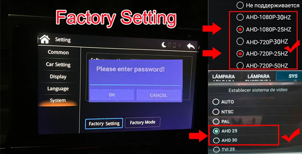 Go to Car settings >> Factory settings >> Reverse (picture) settings >> Select AHD