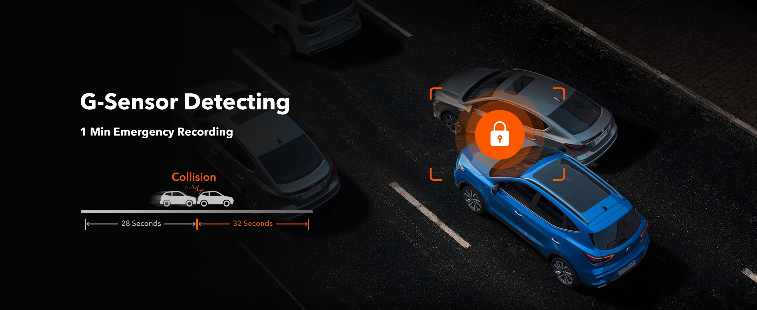 Provides continuous and secure recording monitoring while you are away. The dash cam records in a loop every 1/2/3 minutes until the oldest videos are overwritten by new ones. The G-sensor automatically detects collisions and locks the current video, allowing you to find valid evidence within the locked video.