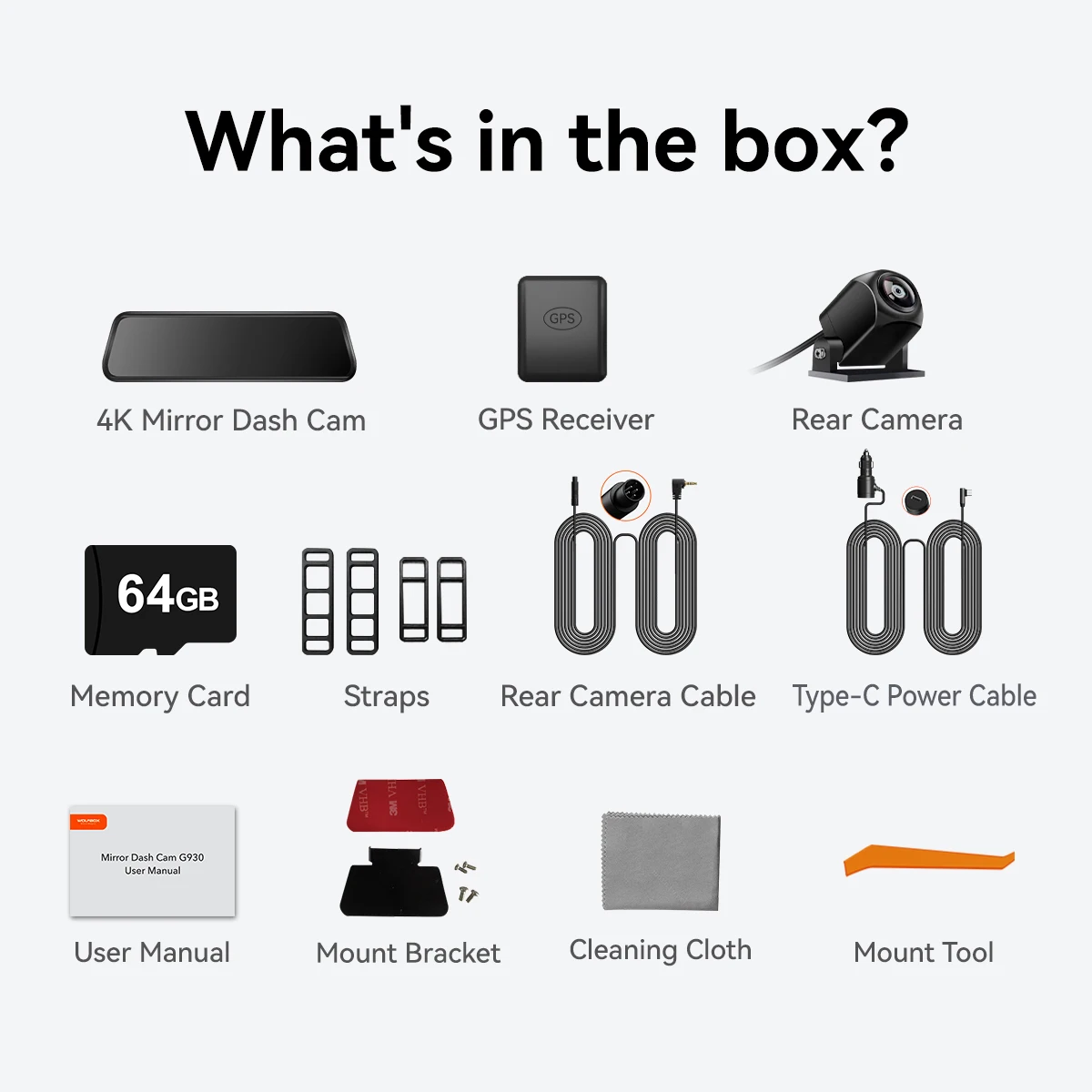 Accessories: 1x G930 Mirror Dash Cam 1x 32GB TF Card 1x Rear Camera 1x Mount Brack