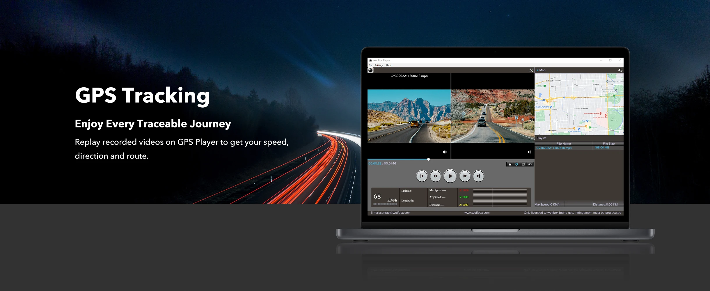 After the GPS receiver is plugged into the dash cam mirror, you can view live speed and direction on the screen. With our mirror dash cam, you can obtain valid GPS information by reviewing all recorded videos on the GPS Player.
