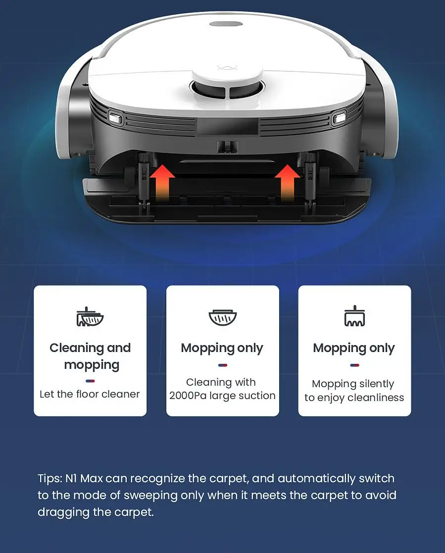 N1 Max with unique lifting structure design,supports switch sweeping and mopping freely,include cleaning and mopping,sweeping only and mopping only,which will bring you the new experience of sweeping and mopping.