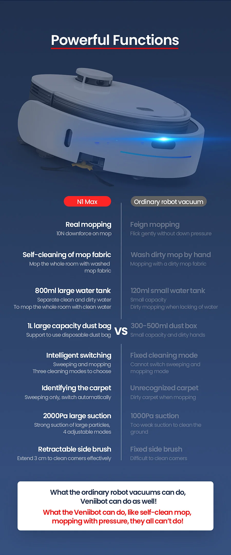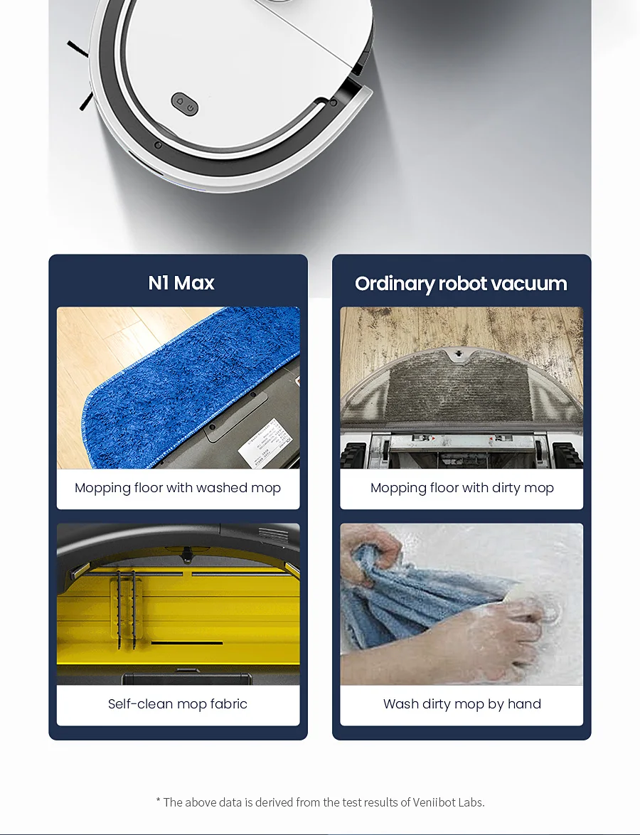 2020 New Veniibot N1 Max Robot Vacuum Cleaner with Self-cleaning Mop Fabrics Systerm Mopping with Pressure APP Control