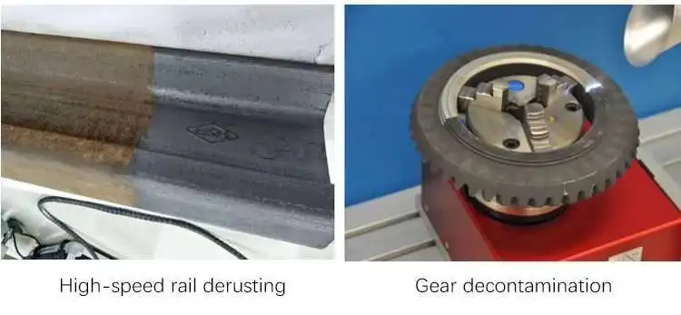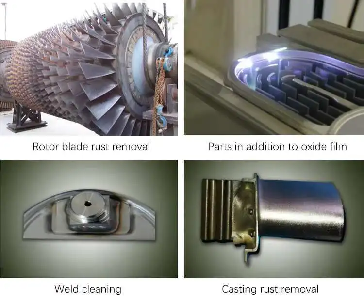 surface of the workpiece, so that the surface oil, rust or coating evaporates or peels instantly, and effectively removes thesurface attachment or surface coating of the cleaning object at a high speed, so as to achieve the cleaning of the object. It is characterized by no damage to the part matrix, no consumables, energy saving and environmental protection.