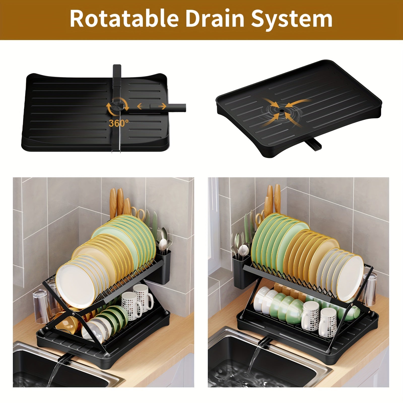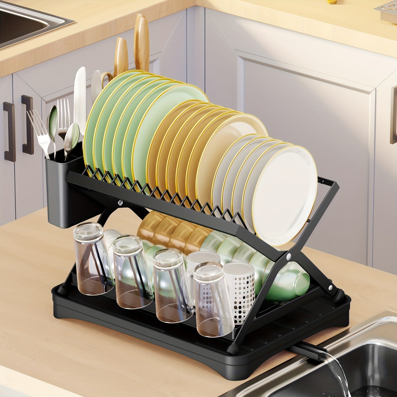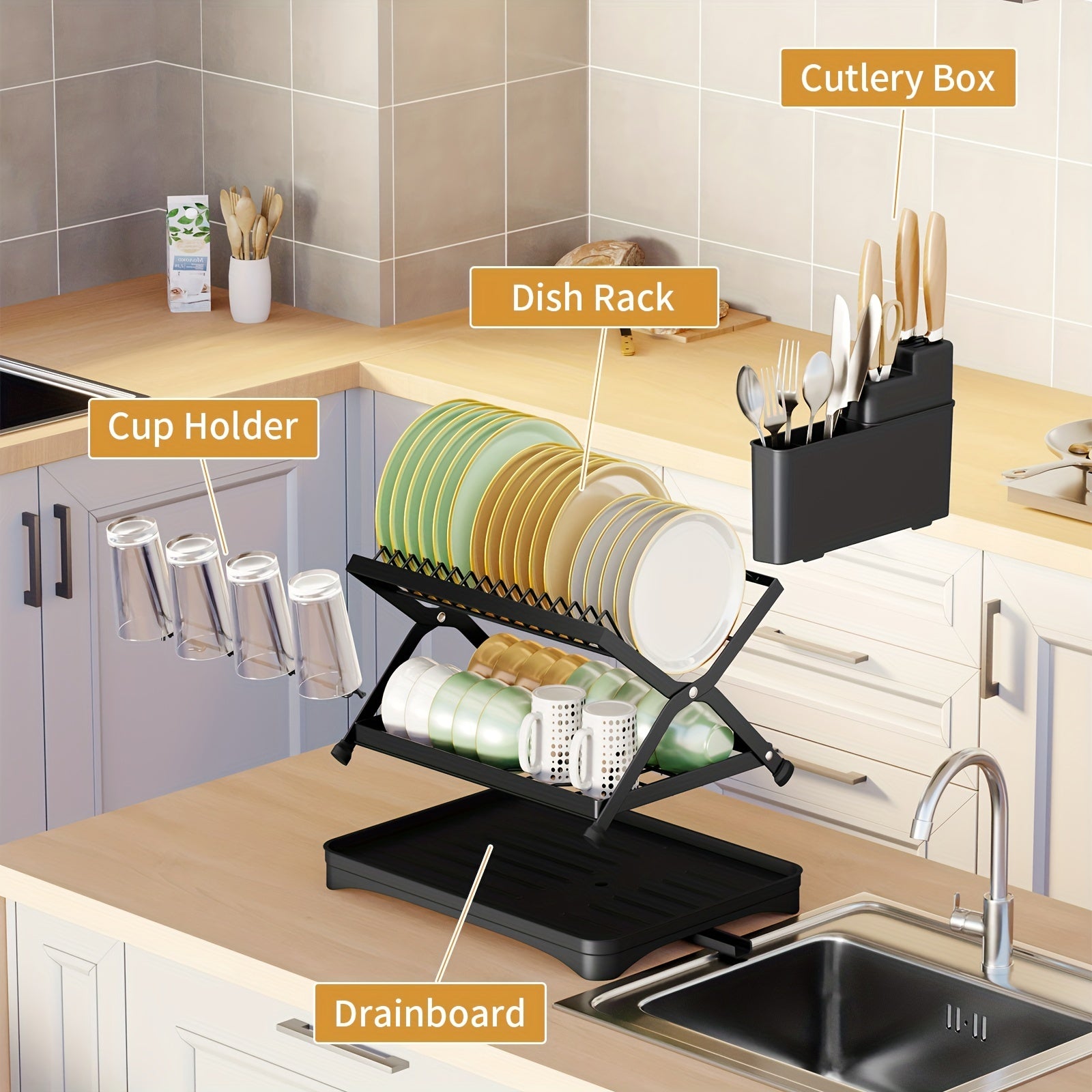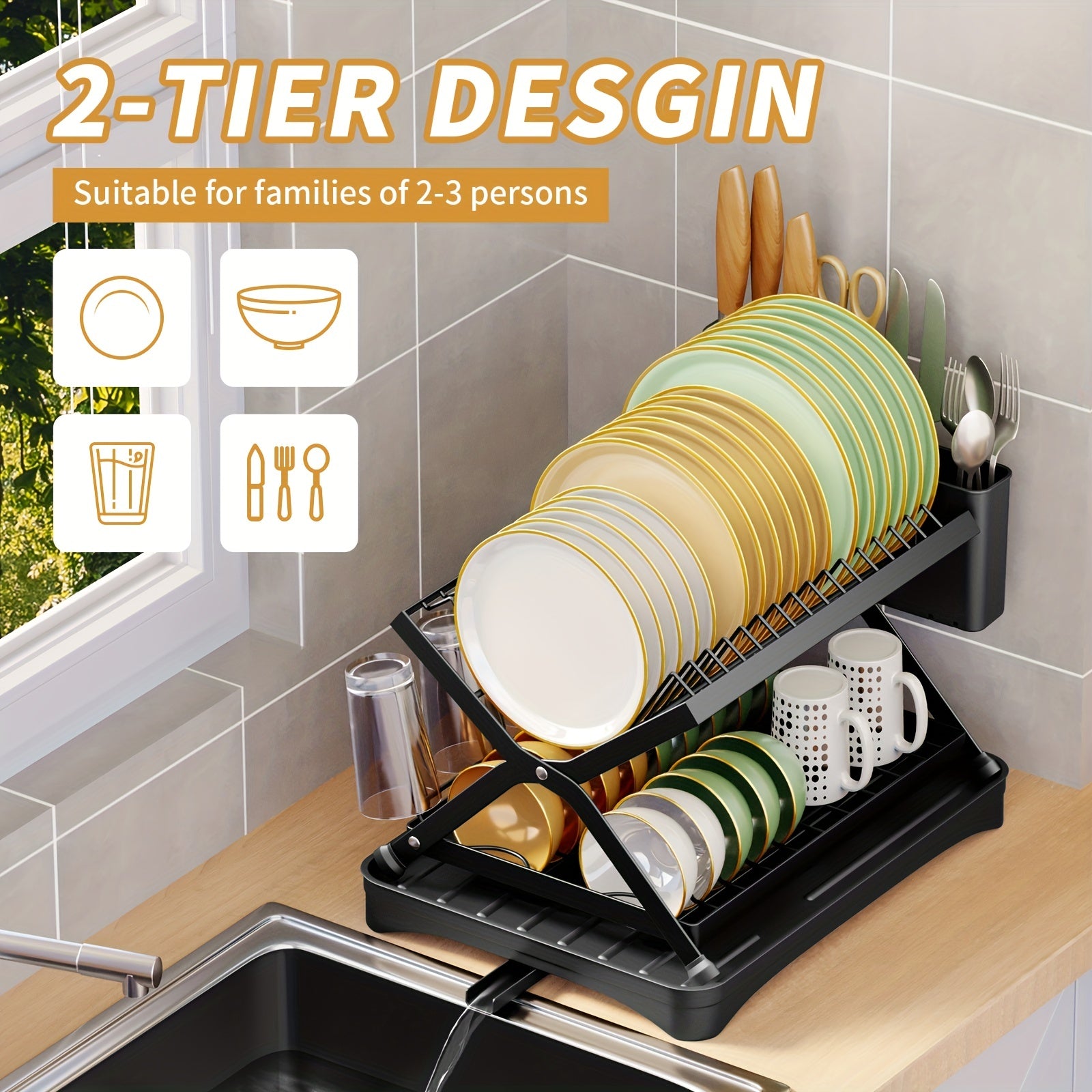 1 Set Dish Drying Rack Collapsible, 2 Tier Dish Rack Foldable With Cup Holder And Cutlery Box, Dish Rackst With Swivel Spout For Kitchen Counter, Dish Drainer With Drainboard, Kitchen Accessories