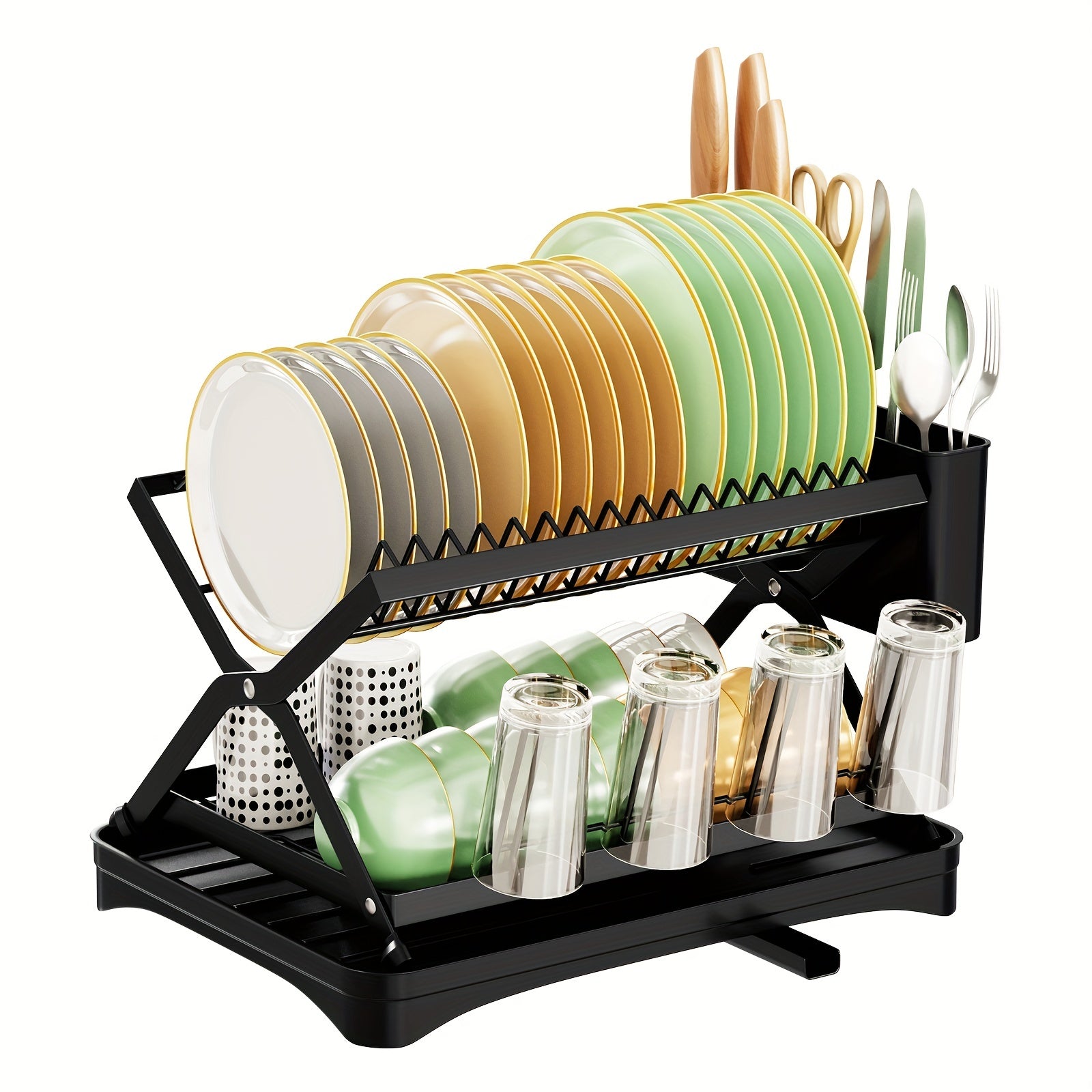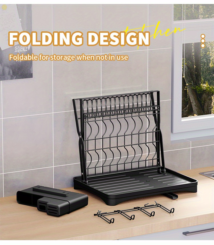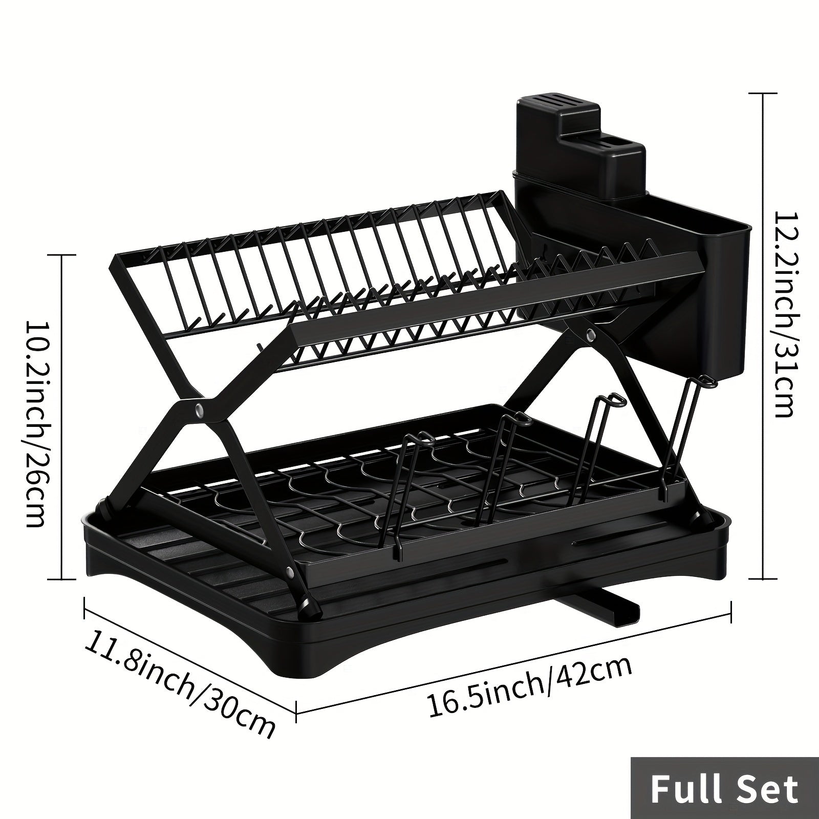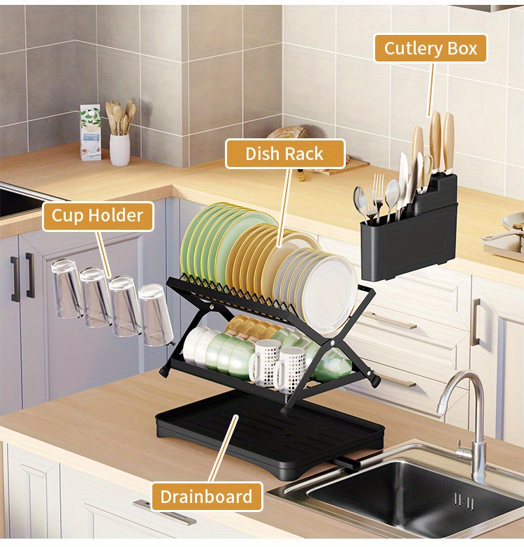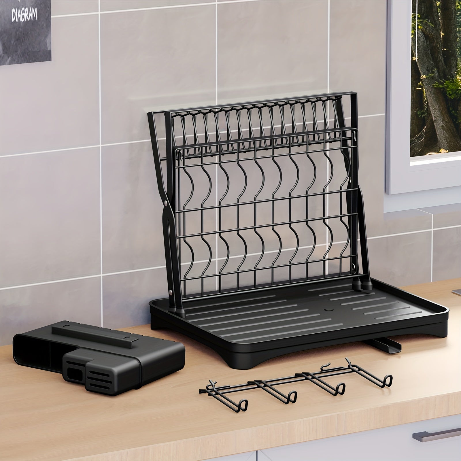 1 Set Dish Drying Rack Collapsible, 2 Tier Dish Rack Foldable With Cup Holder And Cutlery Box, Dish Rackst With Swivel Spout For Kitchen Counter, Dish Drainer With Drainboard, Kitchen Accessories