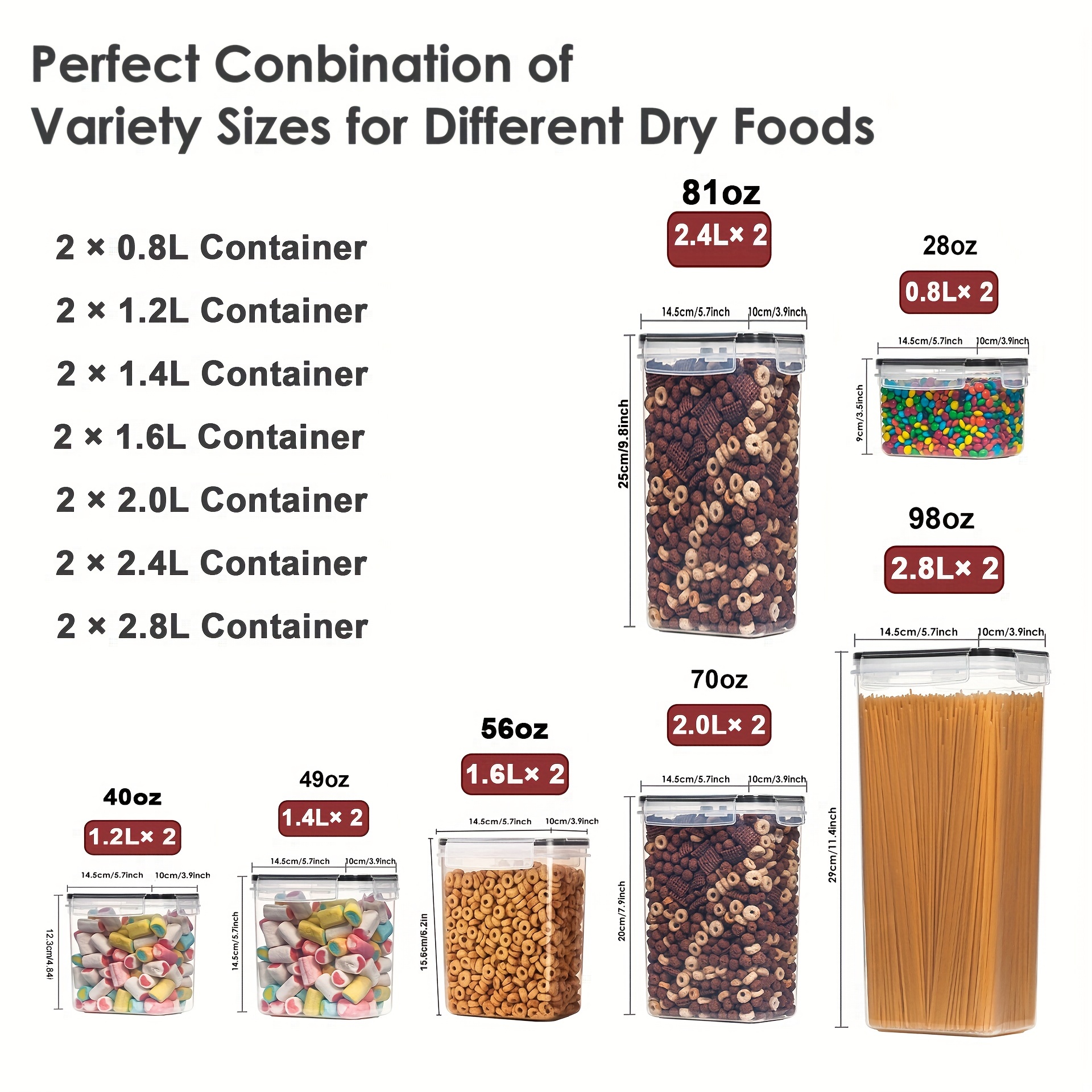7 Size Combinations Fit Your Needs----Our kitchen storage containers set comes in 7 different sizes. Includes 2 Tall Container (2.5quart/2.8 liters), 2 Large Containers (2.2quart/2.4 liters), 2 Large Containers (1.8quart /2.0 liters), 2 Medium Containers (1.4quart/1.6 liters), 2 Medium Containers (1.2quart/1.4 liters), 2 Small Containers (1.1quart/1.2 liters), 2 Mini Containers (0.7quart/0.8 liters). Perfect For storing baking supplies, cereal, flour, sugar, oats, pasta, rice, coffee, tea, snacks