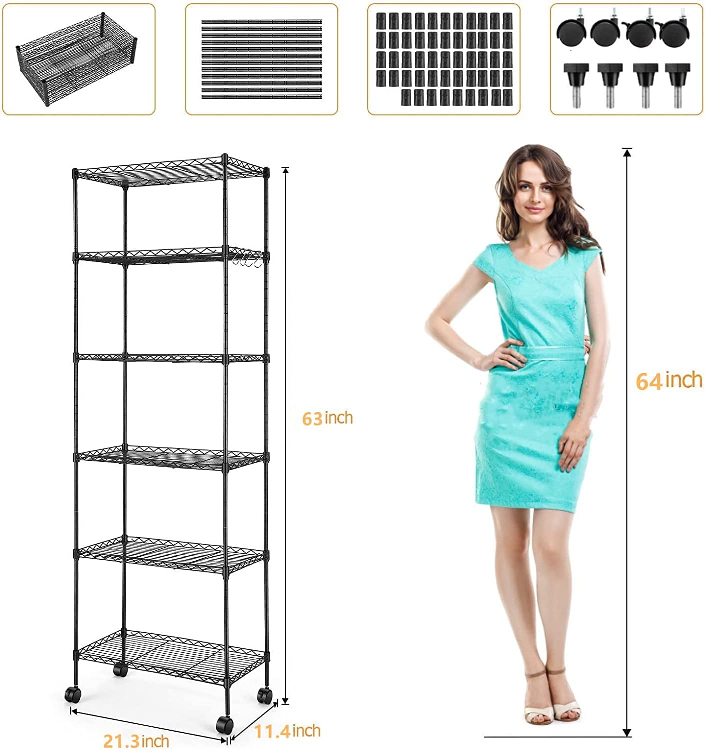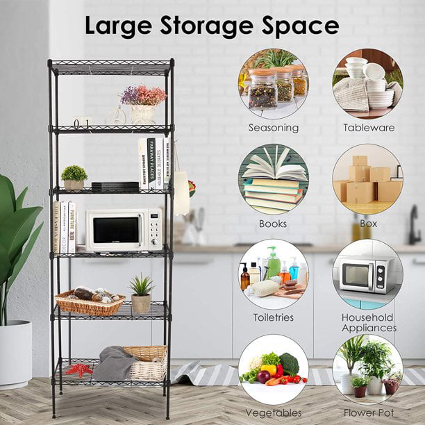 - 6-tier storage shelves (with a big size of 21.3 x 11.4 x 63 inch)
