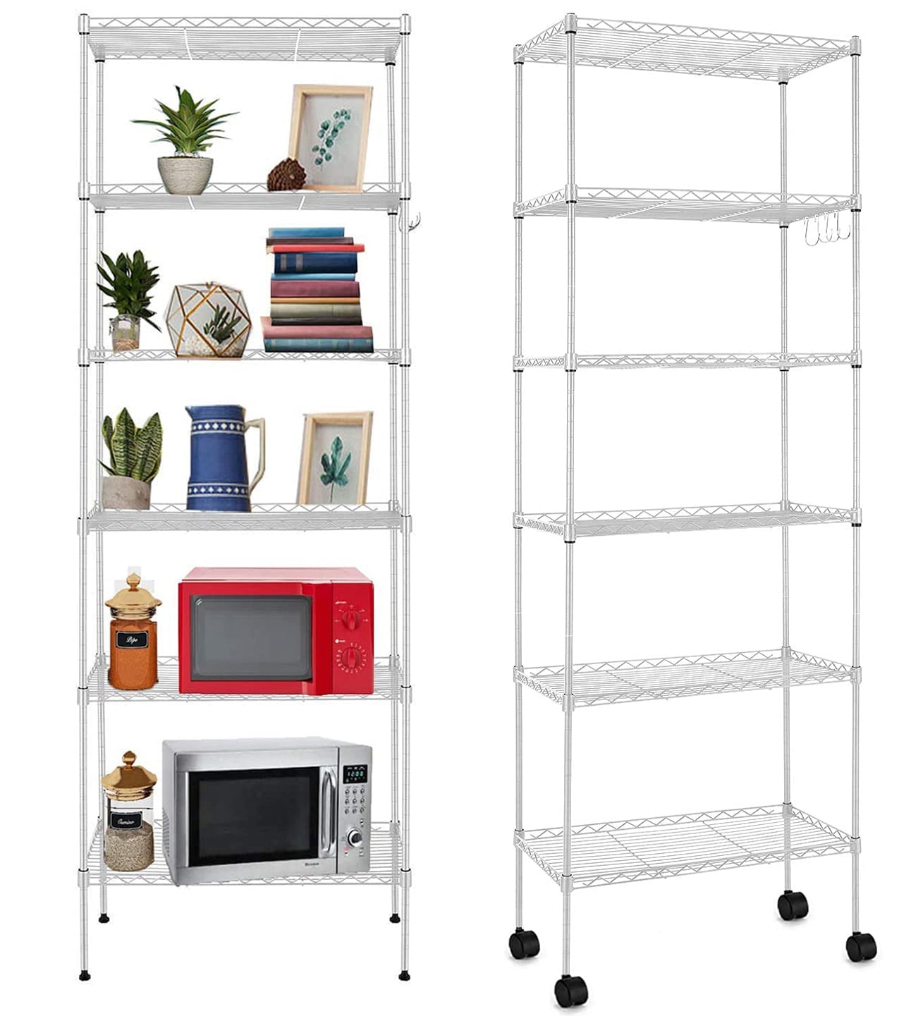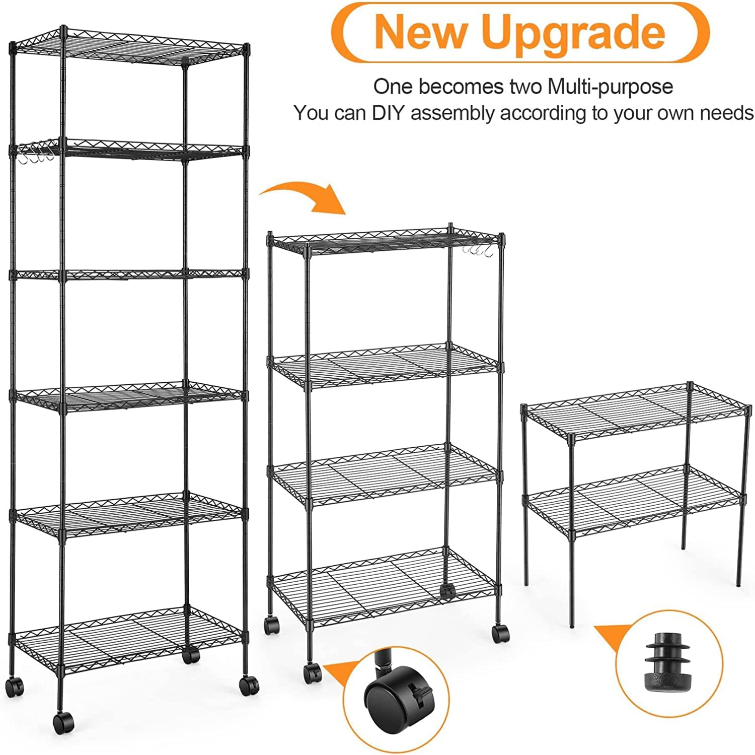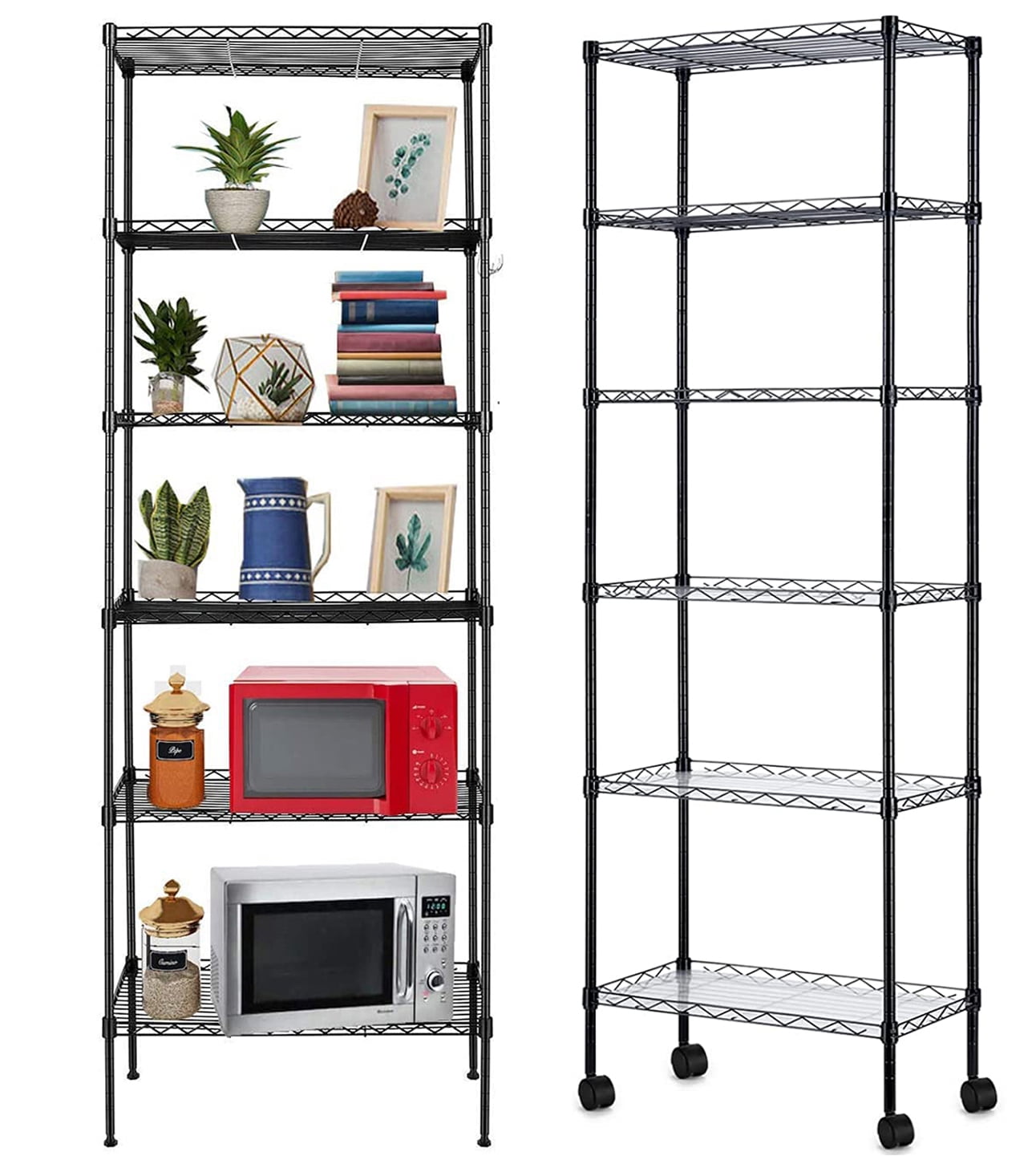 Our 6-tier shelves are made of high-strength carbon steel, which is corrosion and rust resistant, and the 16mm steel rods give the racks a load capacity of up to 260 lbs/120 kg. 6-tier shelf design and 4 side hooks (large size 21.3 x 11.4 x 63 inches). You can fit more items without taking up more space, and each tier is adjustable in height. And it's a shelf storage rack with 4 wheels and 4 leveling feet, 360°rotating wheels (2 lockable wheels) can easily move to anyw and stay in a fixed position. This shelf adopts DIY design, you can assemble it freely, assemble it as a 6-tier heavy-duty shelf or two small shelves (2-tier and 4-tier). This shelf is suitable for use in a variety of indoor and outdoor locations. You are not only buying a storage rack, but also a master of space organization! Don't hesitate to buy it!