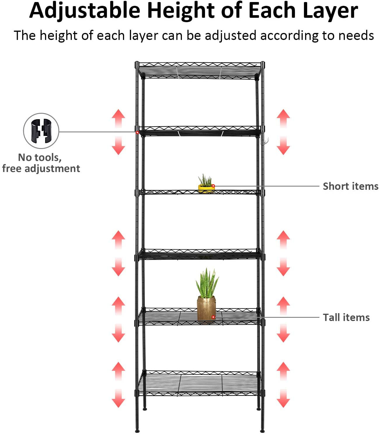 【Quality Upgrade】The 6-tier storage shelves is made of High-Strength carbon Steel, has excellent anti-rust and corrosion resistance, high load strength, good toughness, strong shock resistance ability. The upgraded 16mm steel pole can hold up to 260lbs/120kg.