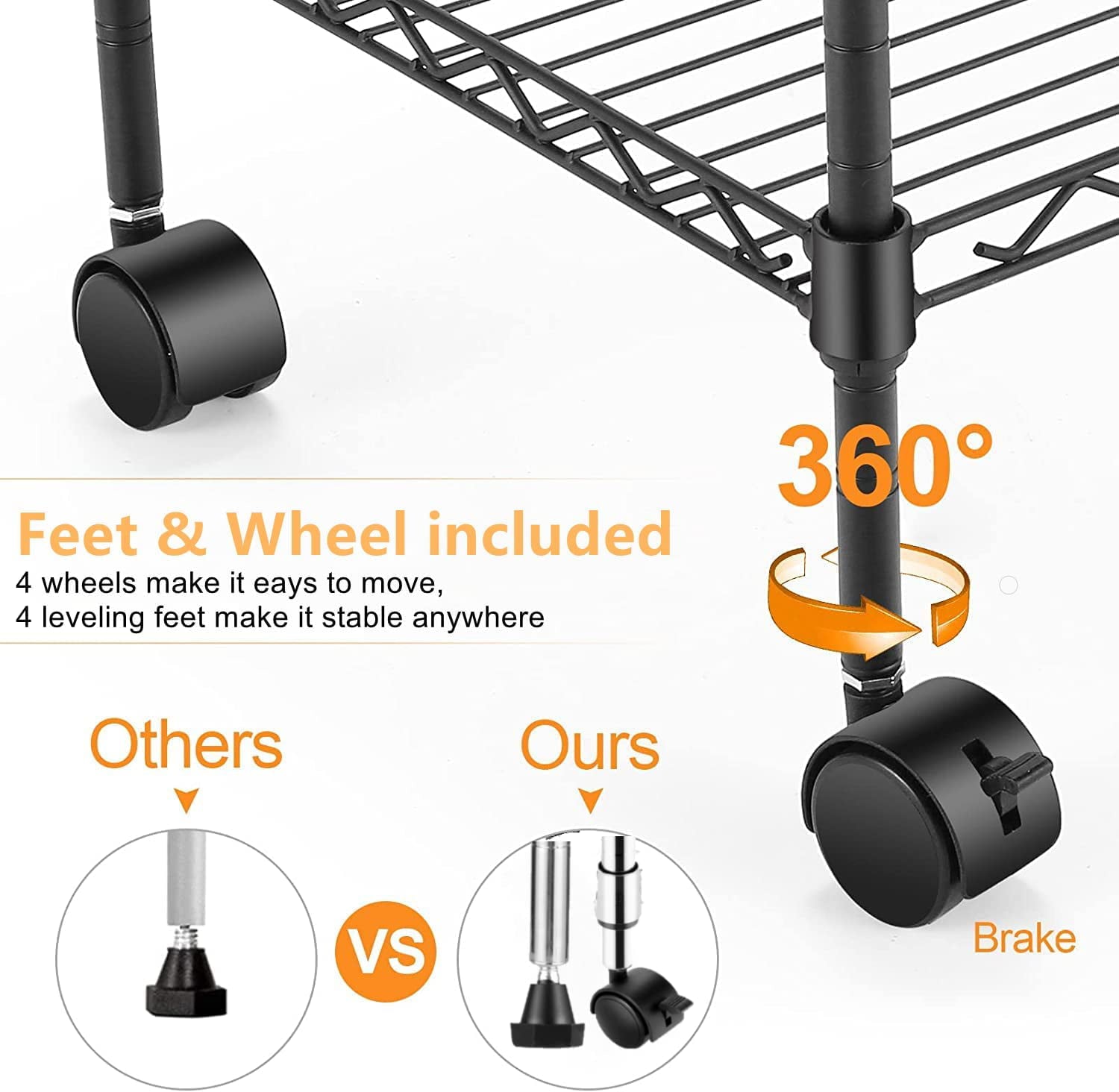 【4 Leveling Feet】4 leveling feet keep the free-standing shelving unit in place and allow you to balance and stabilize it, accounting for any unevenness on the floor.