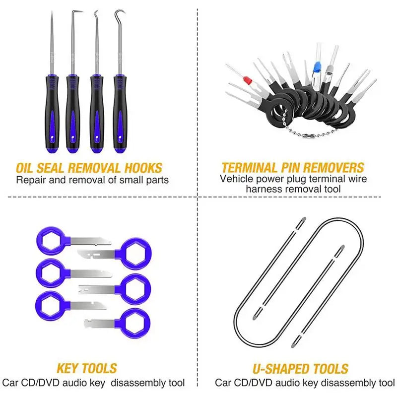 5.Car Radio Removal Tool: Easily pry up car radios or terminals without damaging your vehicle's host system using our Trim Removal Tool. Insert the tools from the kit into each side of the radio; suitable for most cars and motorcycles, making it the perfect terminal pin removal tool.