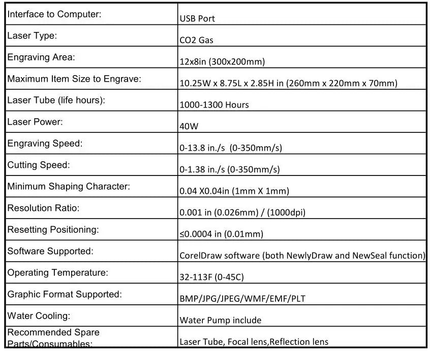 This CO2 engraving machine, with engraving area of 12"x8" (30x20cm), integrates the newest light, machine and electricity mechanical movement to design this high precise and high speed three generation modal CO2 LASER Engraver. Equipped with one 40W water cooling laser tube, high precise stepping motors, and high quality LCD control board. It employs an USB port and thus can be connected to your laptop or desktop. By the support of included software, CorelDraw, this machine can work well with multiple graphic formats including EMF/JPG/PLT/WMF. CorelDraw has the ability of both NewlySeal and NewlyDraw and so it can be employed in both carving and cutting works. All laser engraving machines can not carve / cut metal or ceramics.