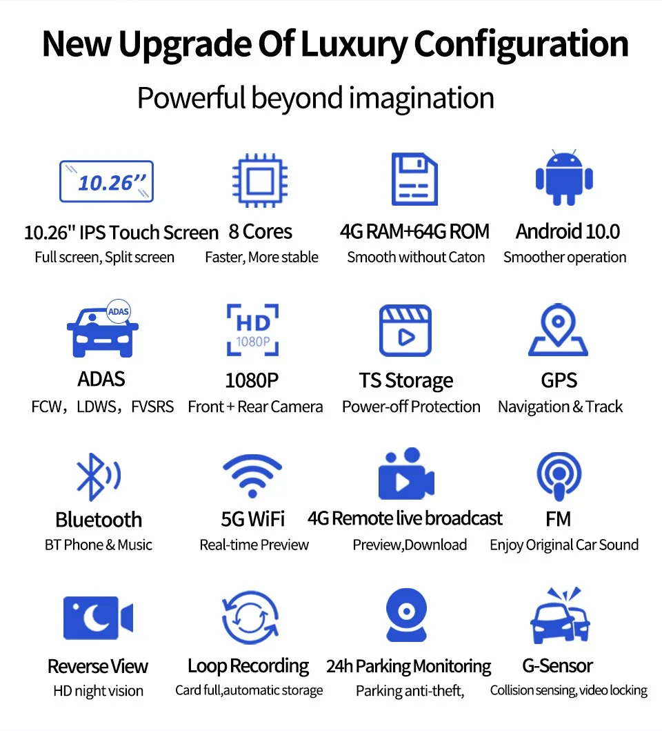 4. With Dual Recording: Front Camera 1080P + Rearview Camera 1080P.