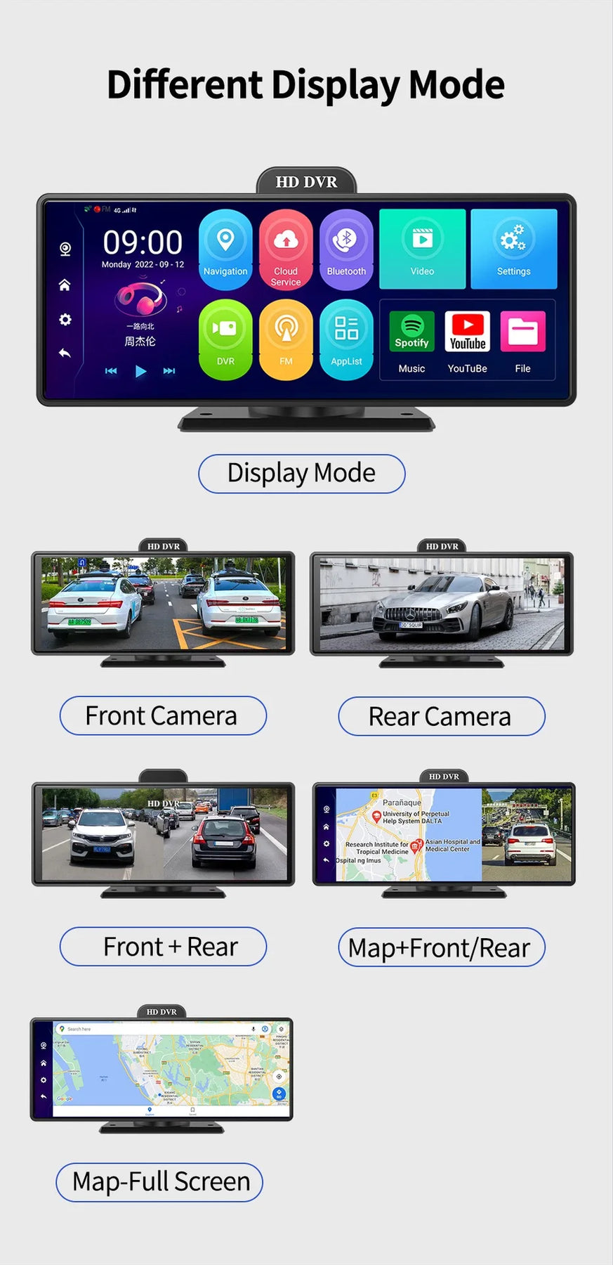 The DVR has 5 kinds of Operation Mode:1.Full screen front camera display ;2.Full screen rearview camera display 3.Front camera + Rearview camera showed at the same time 4.Map + Front camera/ Rearview camera showed at the same time;5.Full Screen Map.You can choose your the display mode according to your driving habit.
